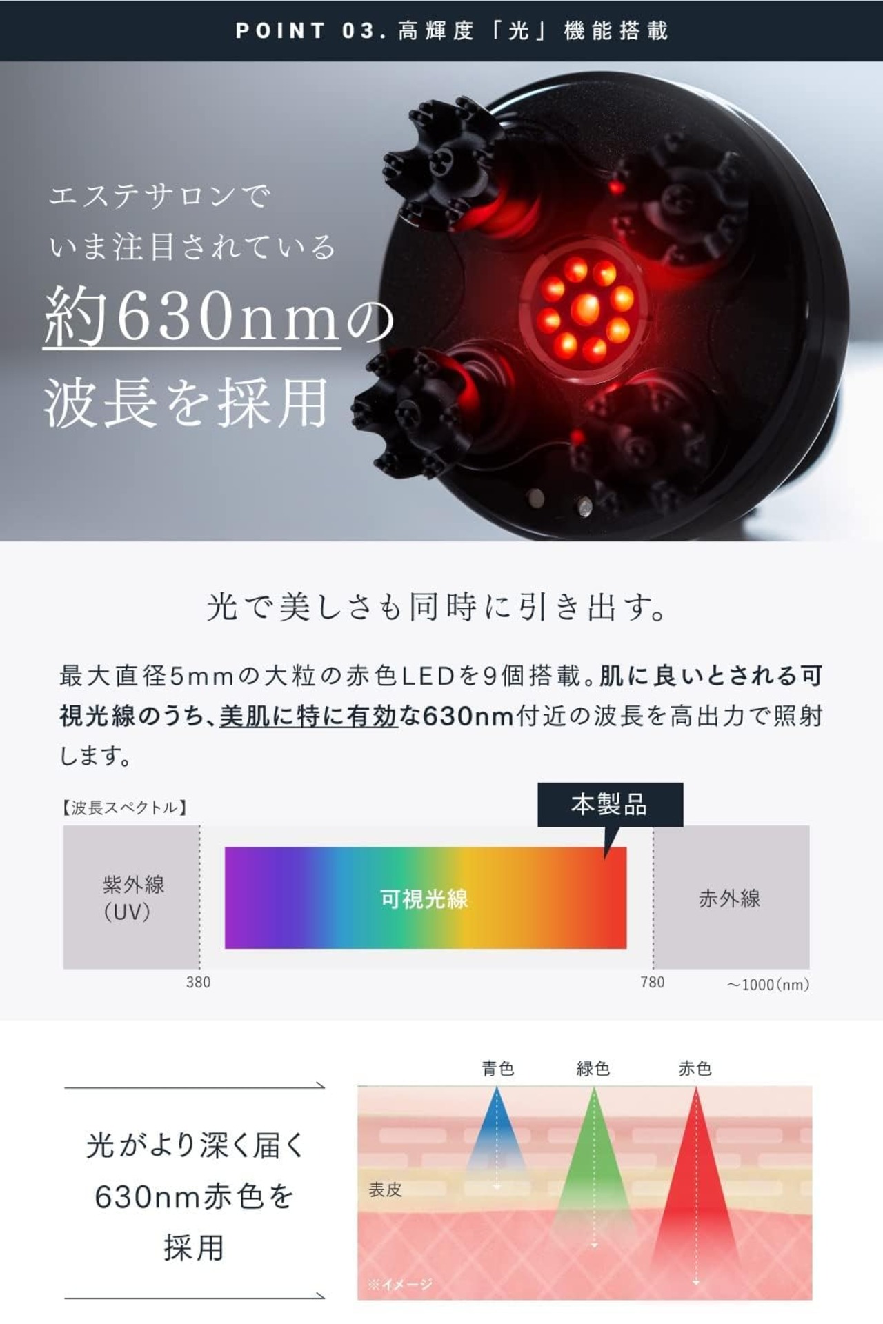 【光機能でサロン級の美肌を】最大直径5mmの大粒の赤色LEDを9個搭載。LED光を拡散させ照射範囲を広くする独自構造でエネルギーをまんべんなく肌に届け、理想の美肌へと導きます。