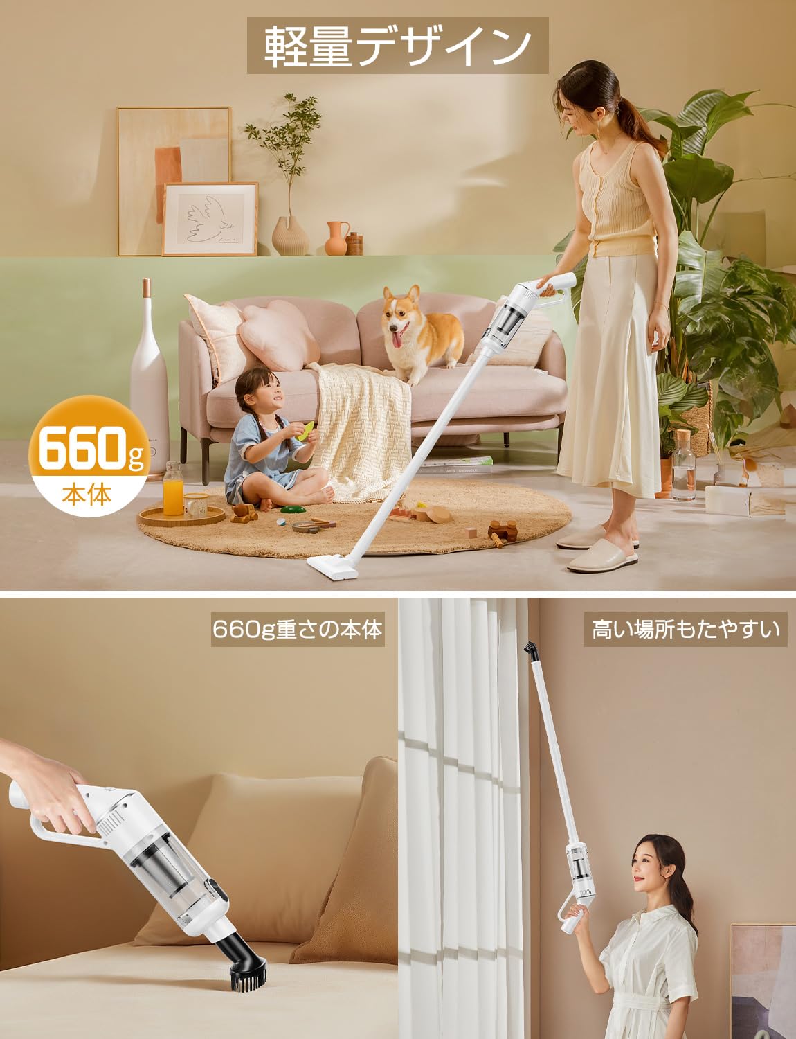 【軽量&コンセントに拘束されない】本コードレス掃除機本体の重さは510gと軽量で、ワンルームマンションに住んでいれば卵10個分の重さになります。手首や肩への負担を気にすることなく、新しい掃除機は生活家事に豊かさをもたらし、負担を軽減します。本品は電源コードのない掃除机です。従来のコード付きスティッククリーナーに比べて、コンセントに縛られる必要がありません。家事をしながら使う場所を決める必要もありません。コードの長さでプラグが外れて家事が中断する心配もありません。