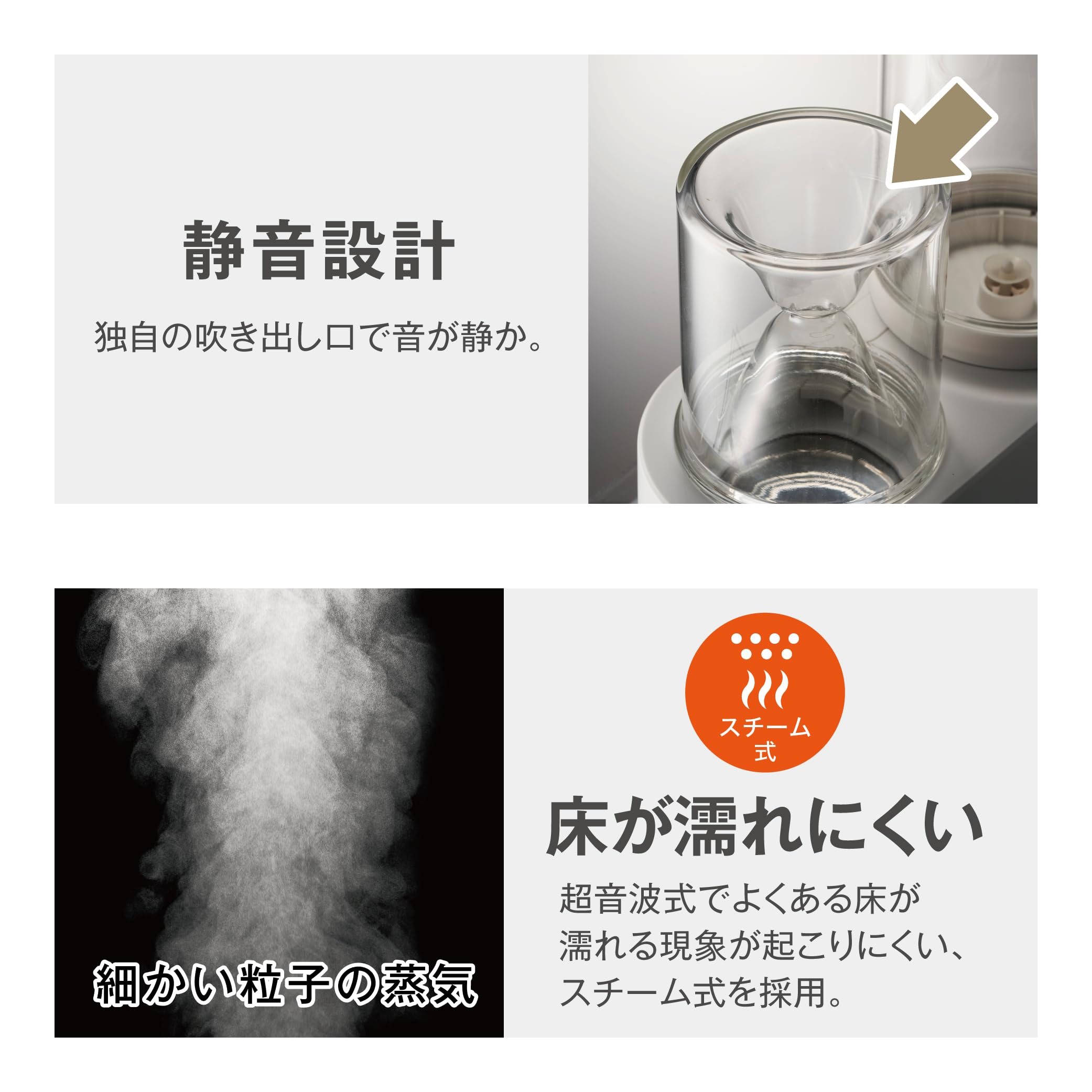 3静音設計。独自の吹き出し口で音が静か。4床が濡れにくい。超音波でよくある床が濡れる現象が起こりにくい、スチーム式を採用。