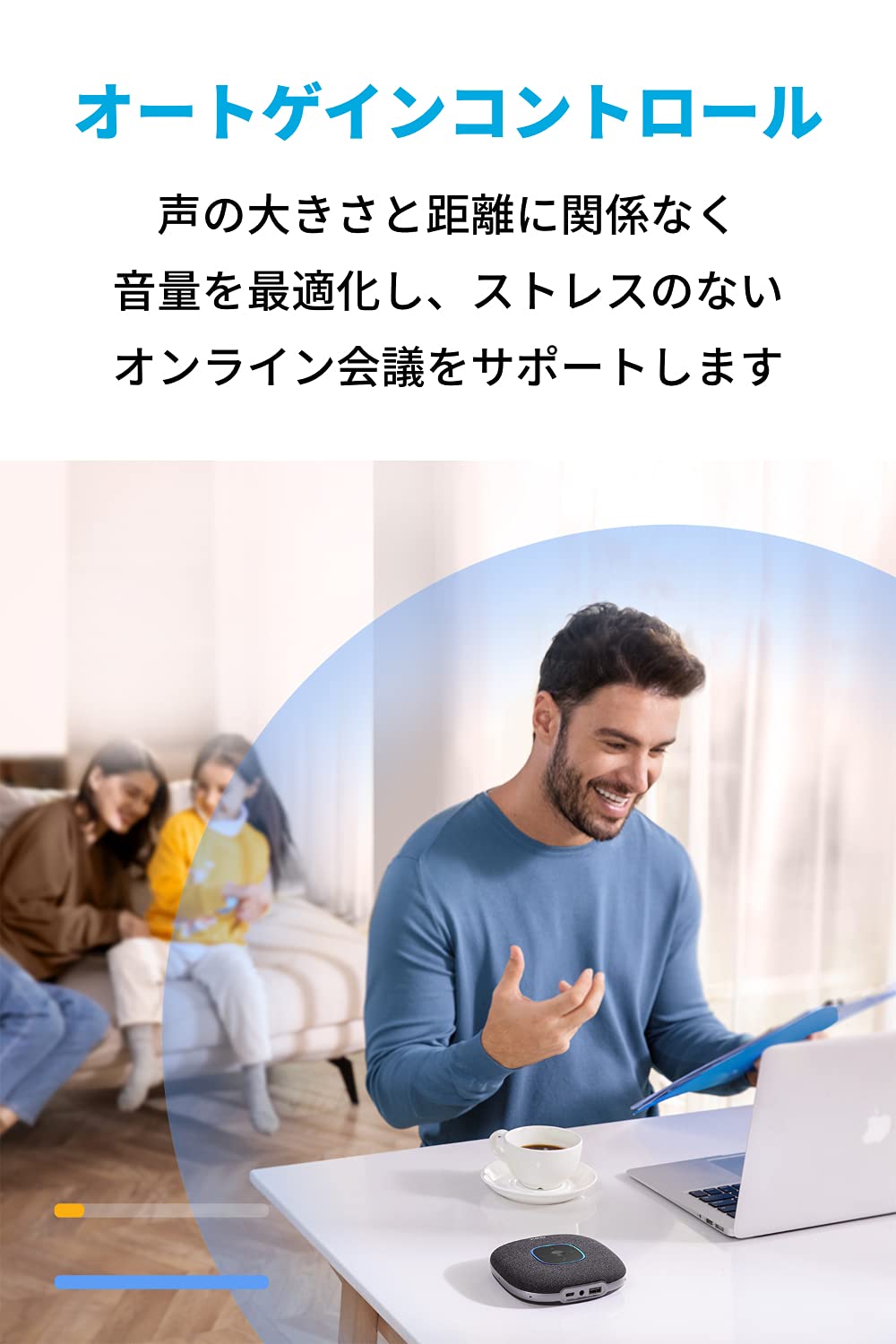 オートゲインコントロール:声の大きさとPowerConf S3までの距離に関係なく音量を最適化します。相手側に均一な音量で声を届け、ストレスのないオンライン会議をサポートします。