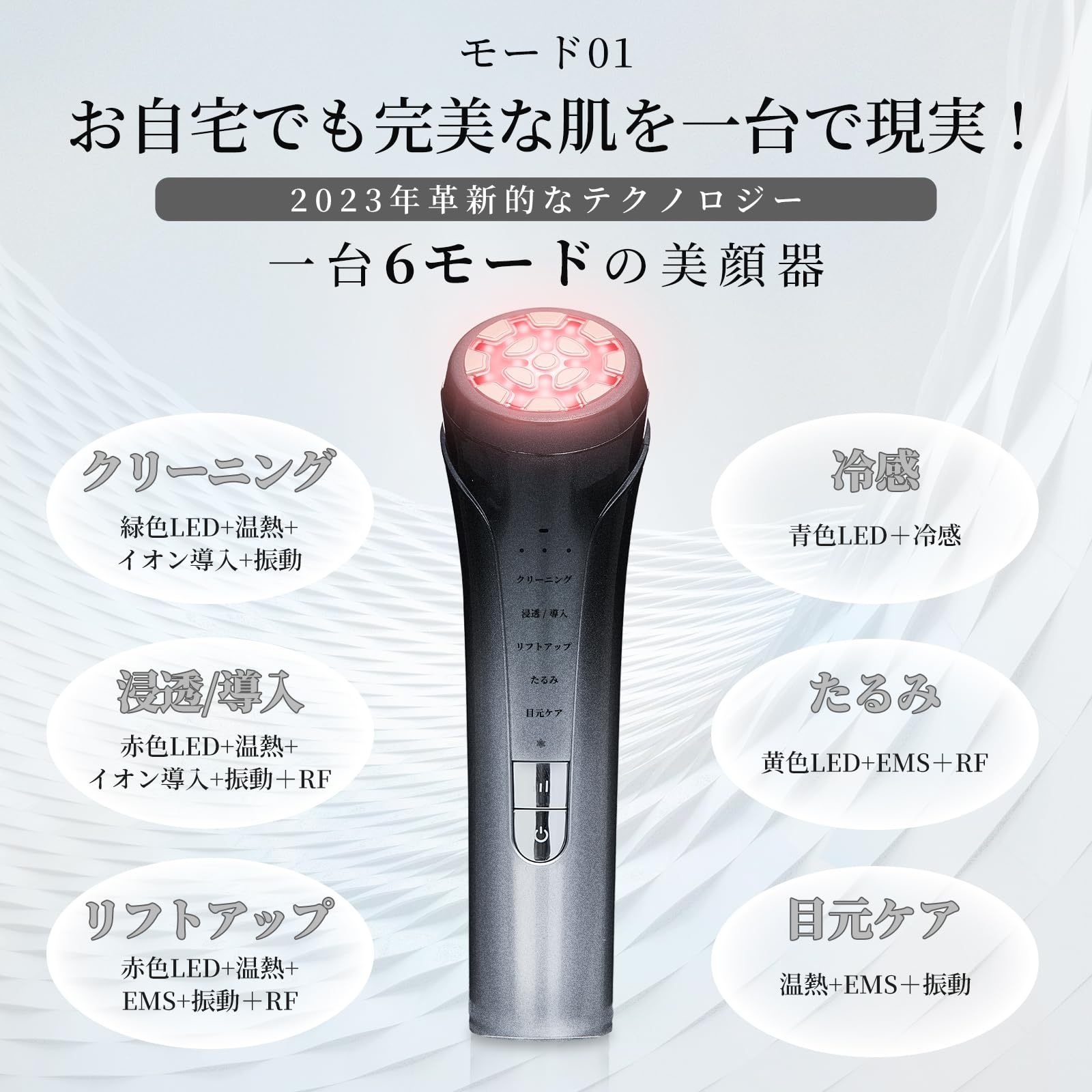 【6種類モード・3段階レベル】本製品は6種類モードがあります。①クリーニングモード:緑色LED+温熱+イオン導入+振動;②浸透/導入モード:赤色LED+温熱+イオン導入+振動+RF;③リフトアップモード:赤色LED+温熱+EMS+振動+RF;④たるみモード:黄色LED+EMS+RF;⑤目元ケアモード:温熱+EMS+振動;⑥冷感モード:青色LED+冷感。6種類モードは多くの人の様々な肌に対応して、別々なスキンケアニーズに満足できます。お客様は、肌の状態やニーズに応じて、モードを選択して使用できます。各モードには3段階レベルが調整できます。レベルを選んでふさわしいケアプランに合わせて肌管理など行います。初めての方は、一番下のレベルから始めることをお勧めします。