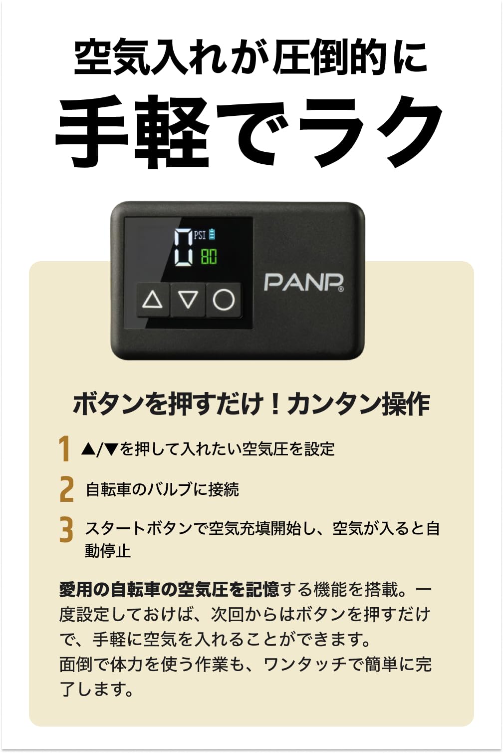 PANP RIDE CYCLE 空気入れ 自転車 ロードバイク 携帯 日本 メーカー (全バルブ対応) 米式 英式 仏式 ボール 電動空気入れ 自動 軽量 小型 コンパクト エアコンプレッサー KUKIIRE スマート空気入れ【保証1年間】