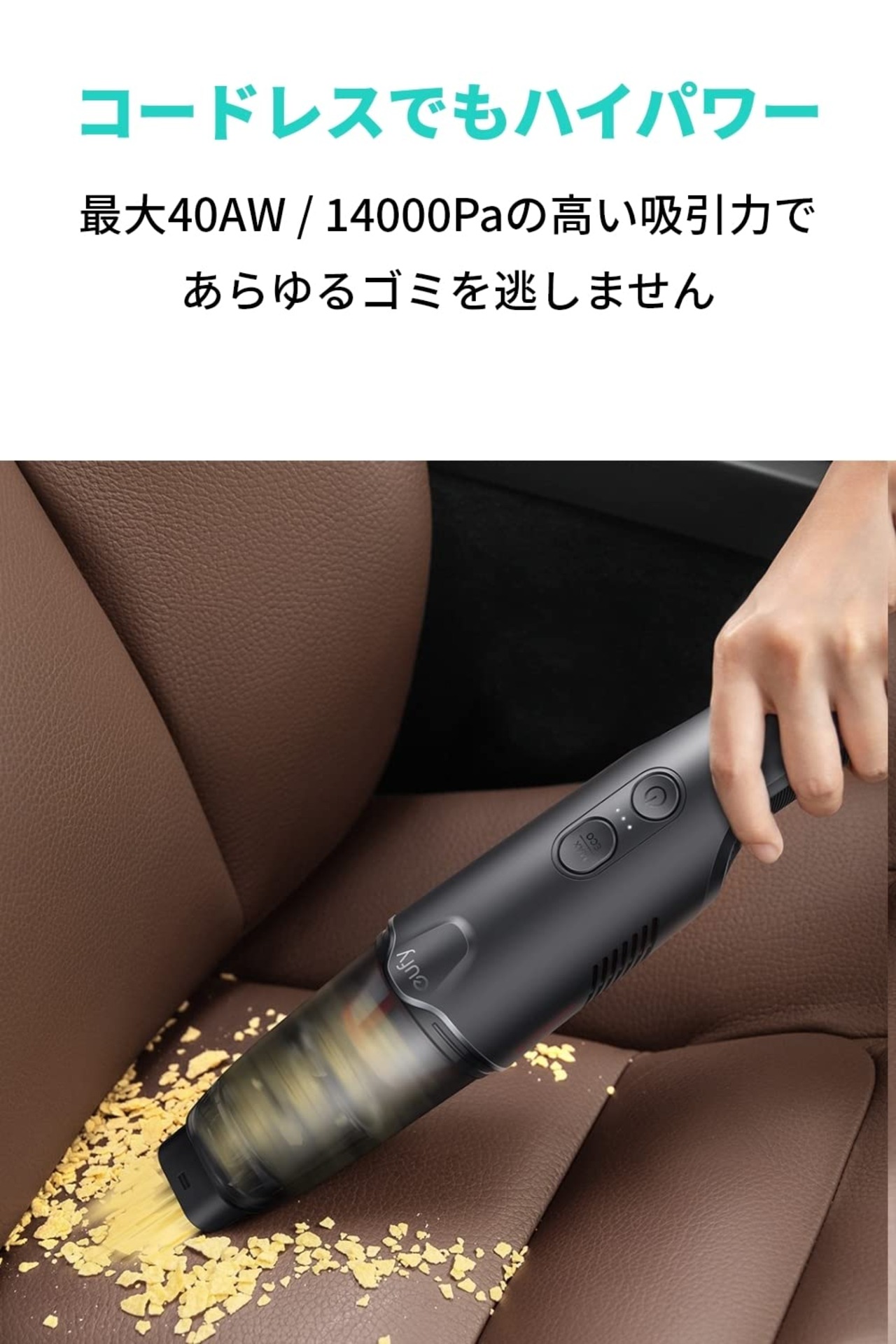 コードレスで強力吸引:最大40AW / 14000Paの強力吸引で、車内のゴミを逃さず掃除。アタッチメントを使用することで、手の届きにくい奥まった箇所や細かな隙間にも対応します。