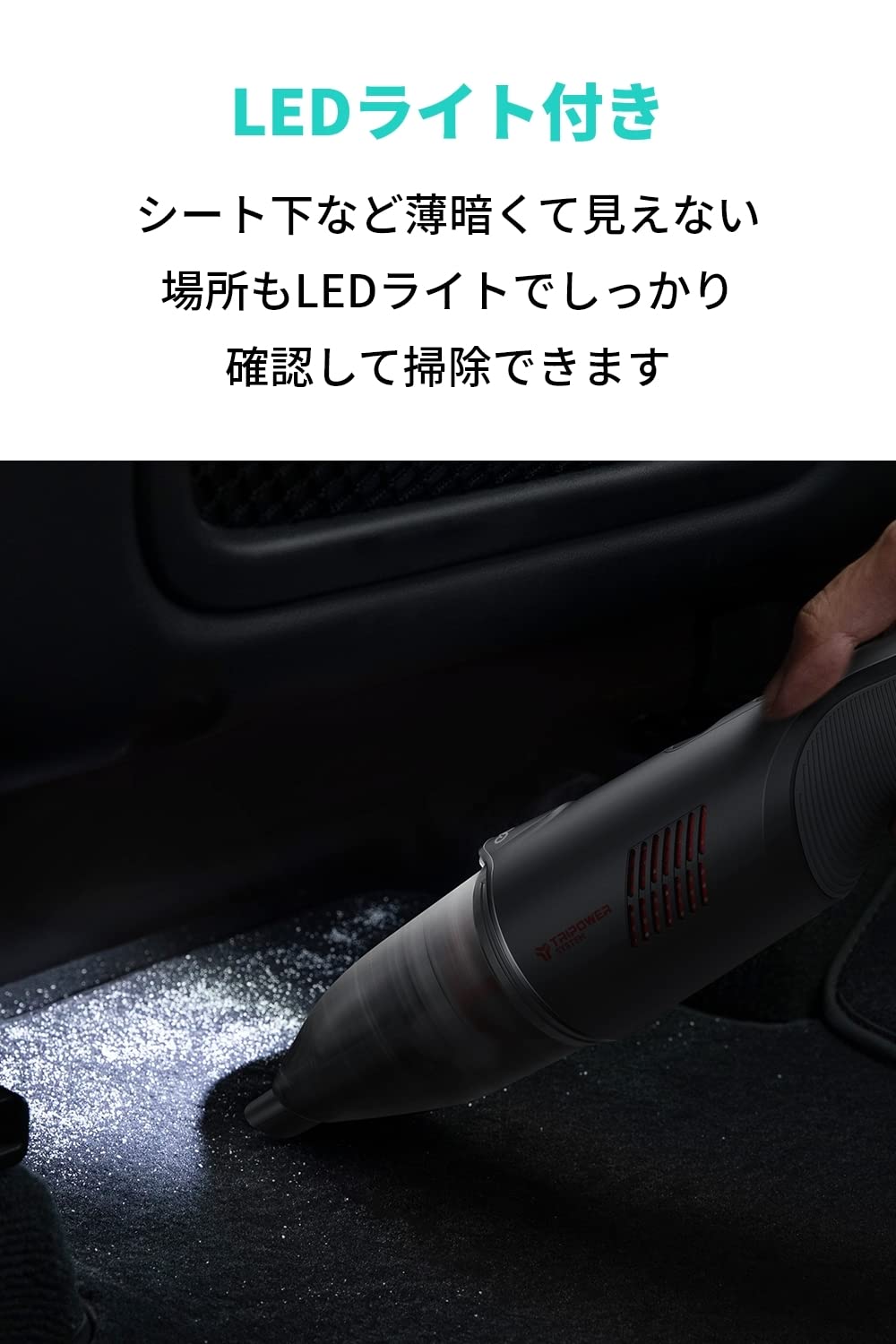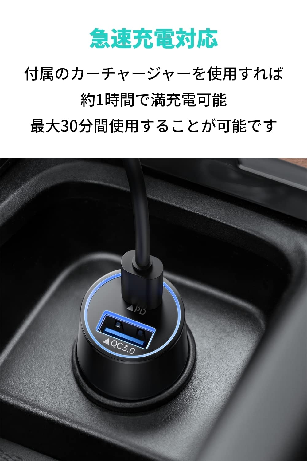 車内で急速充電:カーチャージャーが付属し、1時間で満充電することが可能です。最大30分間の稼働時間で車内全体を掃除できます。