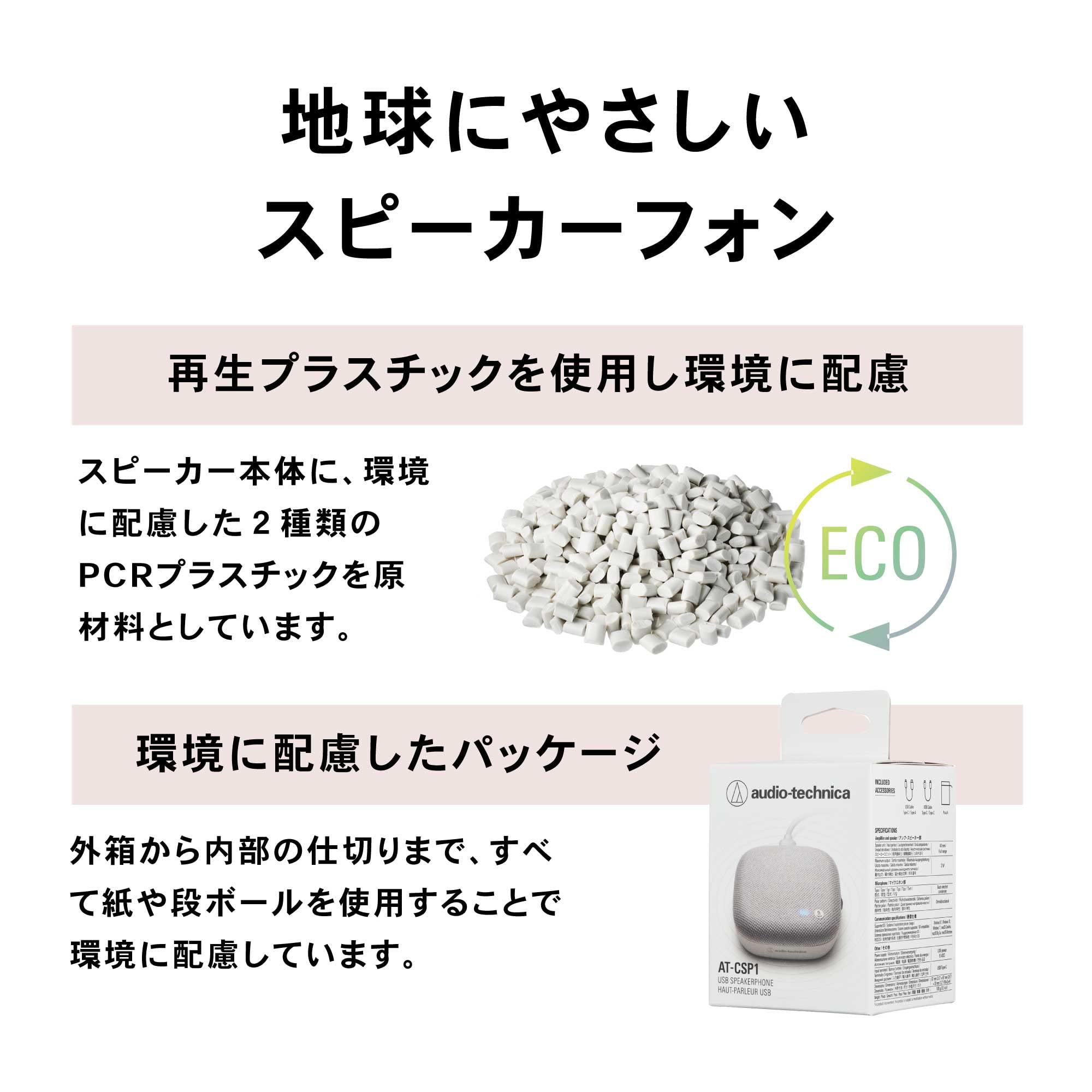 【地球にやさしいスピーカーフォン】再生プラスチックを使用したスピーカーフォン。スピーカー本体に、再生プラスチックを50~70%配合。環境に配慮した2種類のPCR Post-Consumer Resin)プラスチック*を原材料としています。 * PCR プラスチックは、私たちが消費したペットボトルやその他のプラスチックなどをリサイクルした材料です。地域のリサイクルプログラムなどを通じて入手しやすく、より少ないエネルギーと化石燃料で再利用が可能なため、埋め立て地に送られる廃棄物の量を減らすことができます。