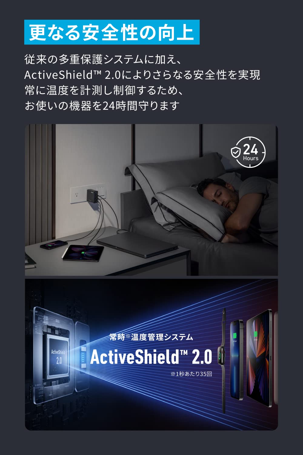 高い安全性:従来製品と同じ多重保護システムに加え、ActiveShield️ 2.0により優れた安全性を実現。独自の温度管理と接続端末の保護システムでお使いの機器を24時間守ります。 また、電気用品安全法が定める技術基準への適合はもちろんのこと、国際的な安全規格であるIEC 62368-1の基準にも準拠しています。