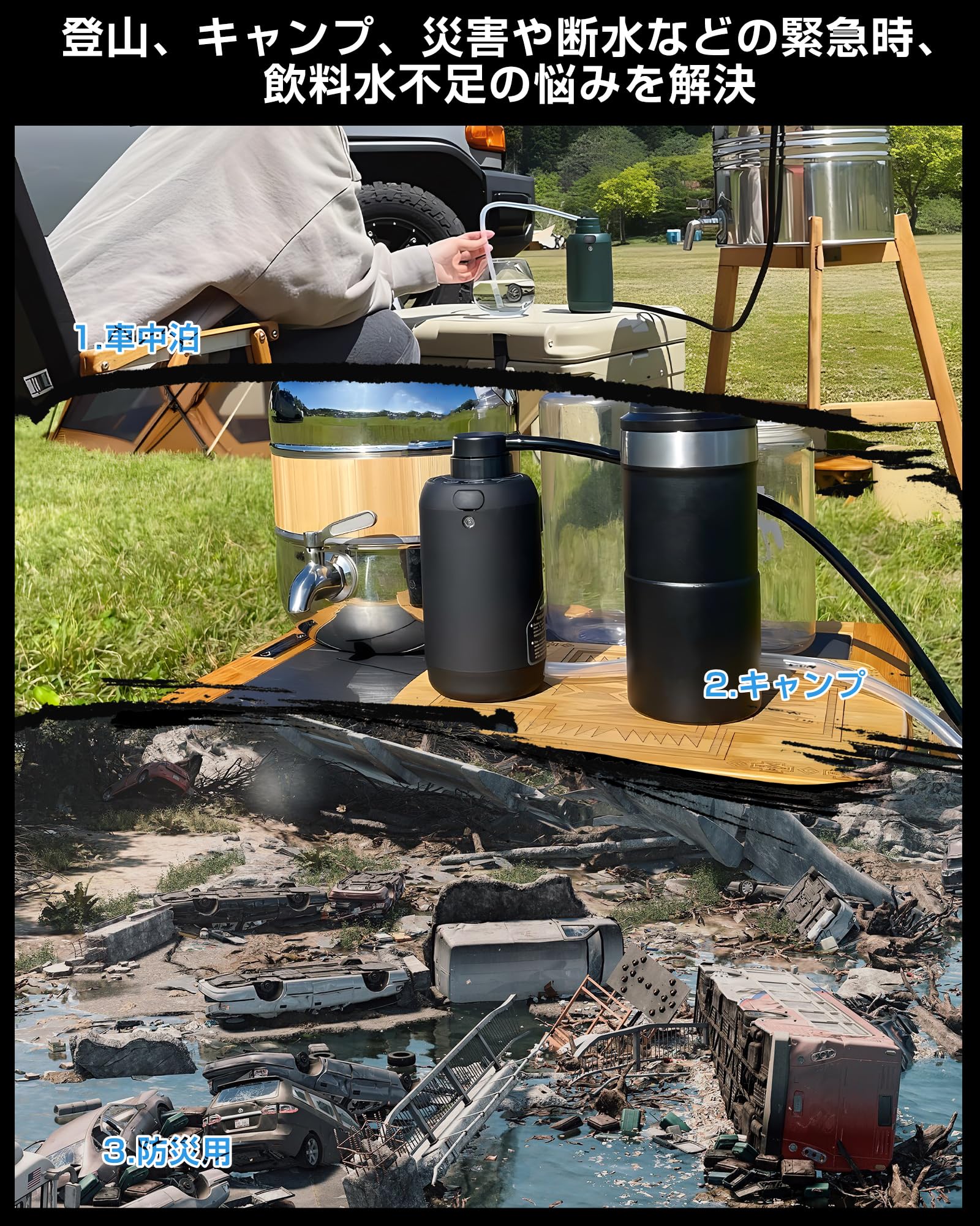 【ワンタッチ簡単水ろ過&USB充電】弊社が開発したこのアウトドア電動浄水器は、他社にはない自動給水機能も搭載しており、ワンタッチ起動で吸引吸入の手間が省けます。大容量の2800mAhリチウム電池を内蔵し、フル充電で180分間の連続使用が可能で、フル充電で120L以上の水を連続ろ過できます。一度にたくさんの水を浄水できるため、地震、津波、台風などの自然災害が発生した場合、家族や友人など大人数で使用しても、飲み水に困りません。 また、USB Type-C充電ポートを搭載しているので、バッテリーが切れたときにモバイルバッテリーを使って充電するのに便利です。