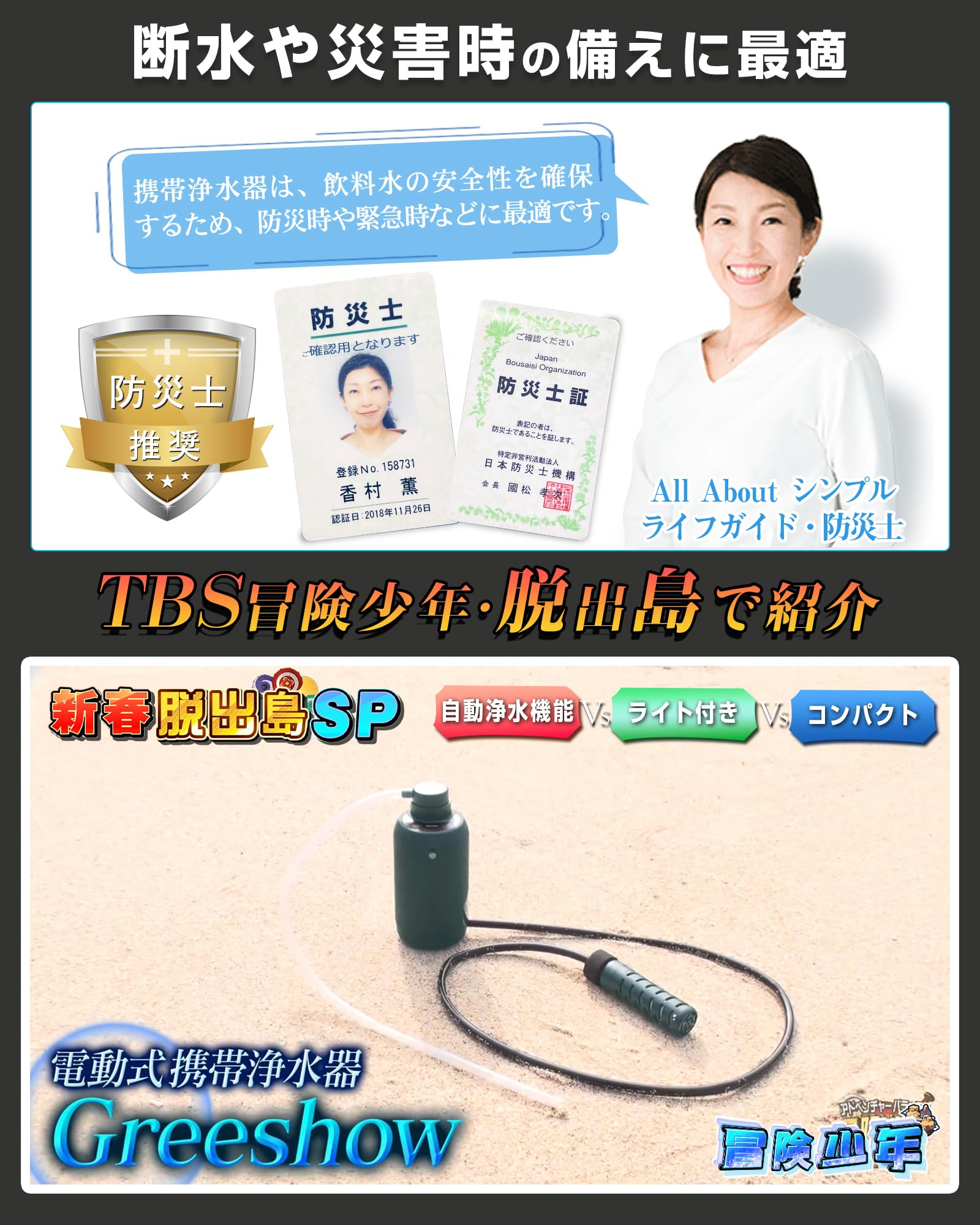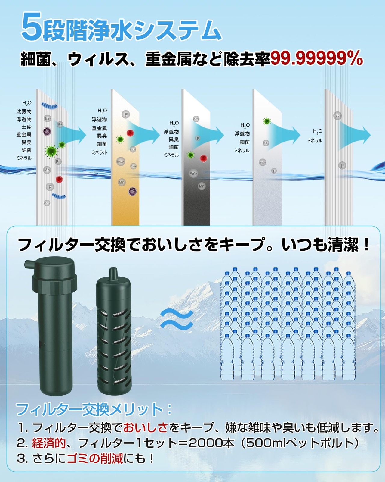 【5段階浄水システム】業界新型開発の電動携帯浄水器GS-2801は、5段階のろ過を行なう浄水システム(ウルトラプレフィルター+ KDFフィルター+高品質の活性炭フィルター+レベルPPコットン+内蔵ウルトラフィルター)と超高品質の0.01ミクロンマイクロファイバーフィルターを採用し、99.9999%の細菌をろ過することができます。フィルターを定期的に交換することで、より衛生的で安心とおいしさをキープ、ミネラルウォーターよりもおトクでエコ!※フィルターはGreeshow店サイトで購入できます。交換用 内蔵/外付けフィルター ASIN:B0CJQTPN4X。