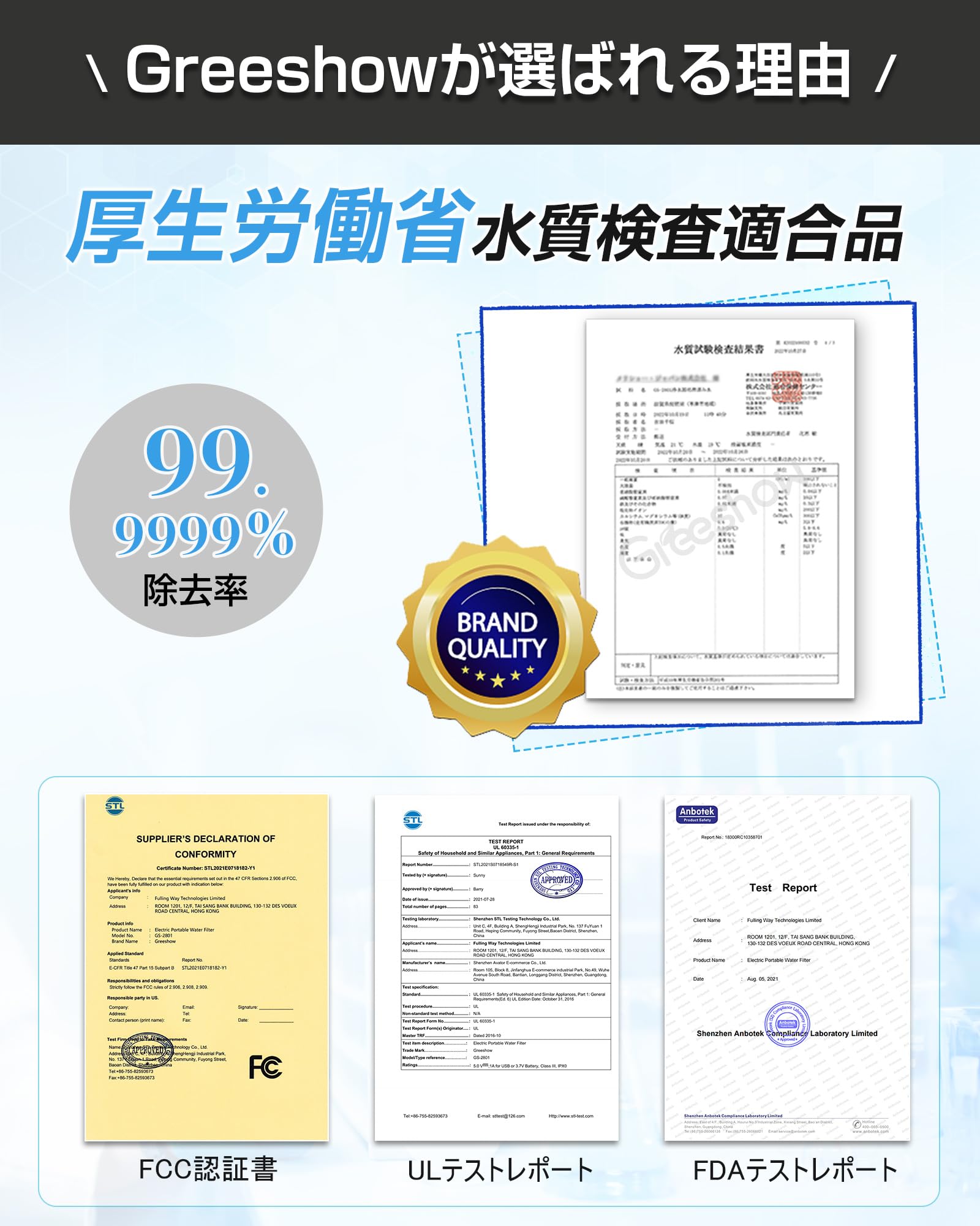 【安心のアフターサポート】Greeshow 携帯浄水器は、日本の厚生労働省水質検査機関にて実証された最高水準の除去率99.99999%を誇ります。この製品には、1年間のメーカー保証が付いており、日本語の説明書と保証書も同梱されていますので、安心してお試しいただけます。万が一、商品の故障や不具合が発生した場合でも、お客様のご不安を解消するために迅速に対応いたします。どうぞお気軽にお問い合わせくださいませ。