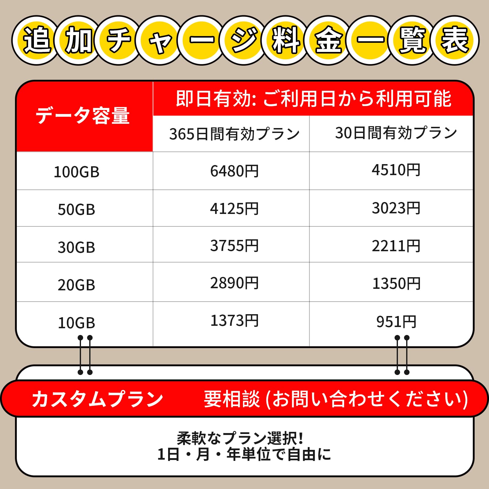 【追加購入が簡単】FREEBOTアプリから24時間365日で追加購入可能です! ・追加年間データプラン 100GB/6480円、60GB/4950円、30GB/3755円、10GB/1373円、1GB/160円※さらにお得なデータプランはFREEBOT APPでご確認いただけます。