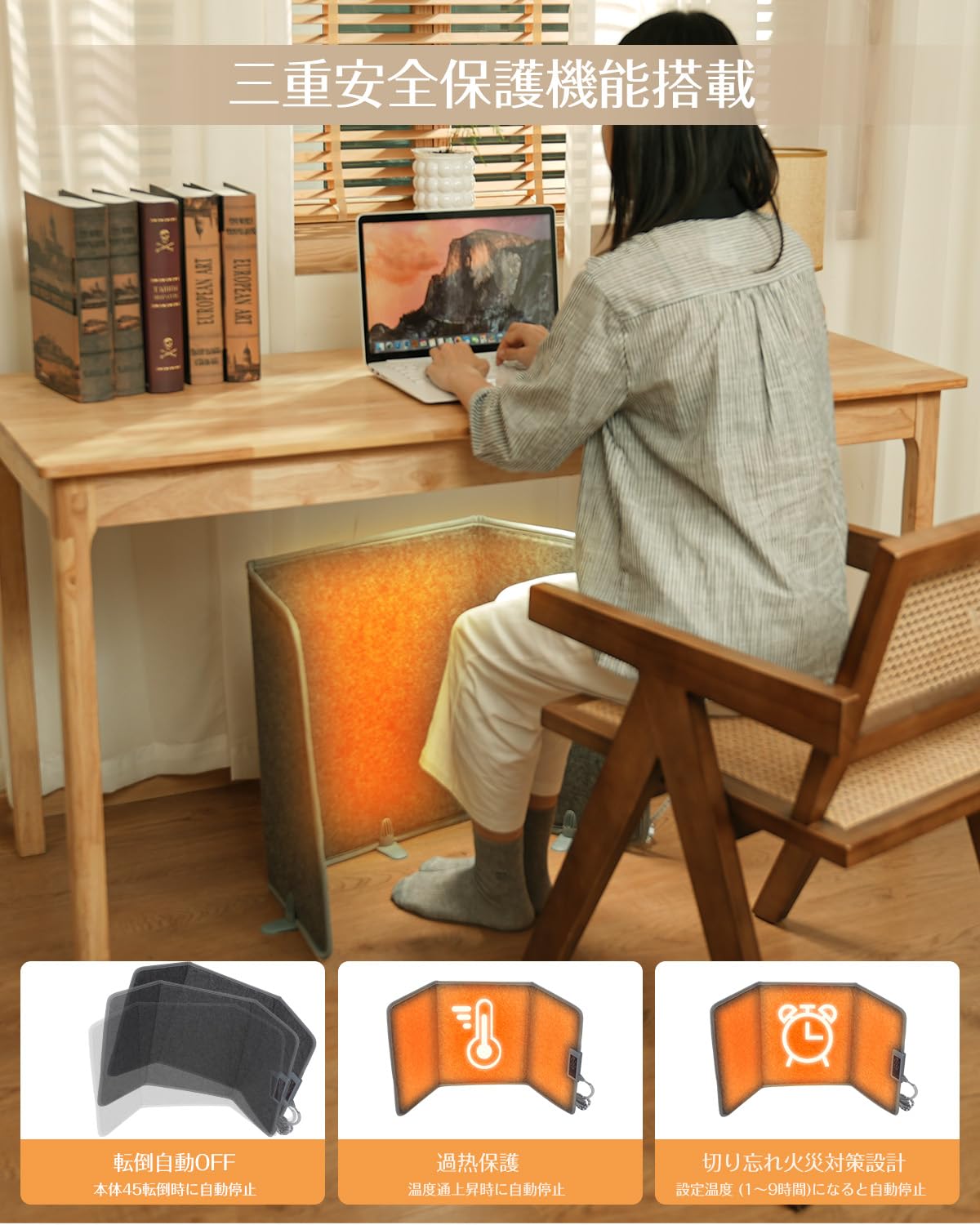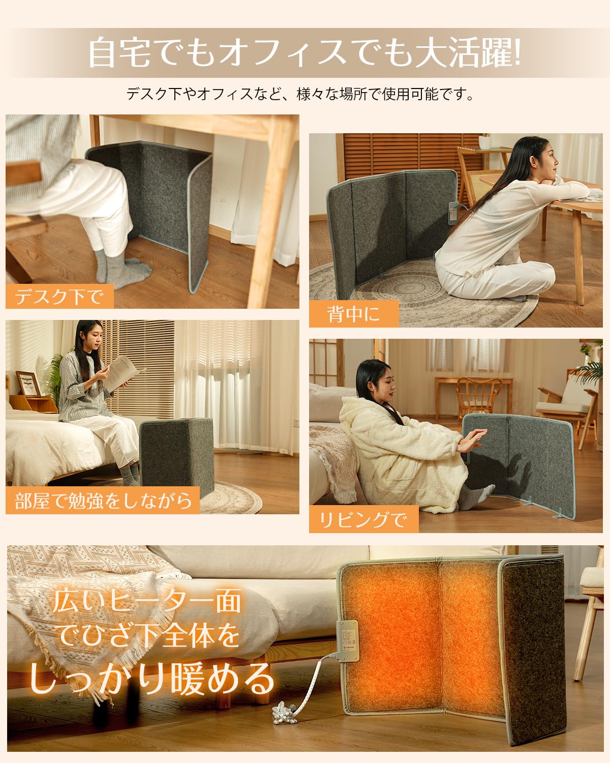 折りたたみ式のため収納や持ち運びも簡単で、省スペースながら高性能な暖房を実現し、寒さに悩むすべての方におすすめできる次世代型デスクヒーターです。膝から足元までじんわりと温めてくれる無音・無風設計の足元パネルヒーターは、冷えやすい足元をしっかり囲んで暖めることで、体全体の冷えを防ぎ、冬のデスクワークやリラックスタイムを快適にサポートしてくれます。広いヒーター面を採用しているため、ひざ下全体をムラなくカバーし、冷えを感じやすいオフィスや自宅の作業スペース、勉強部屋、リビングなど、さまざまな場所でスポット暖房として活躍します。