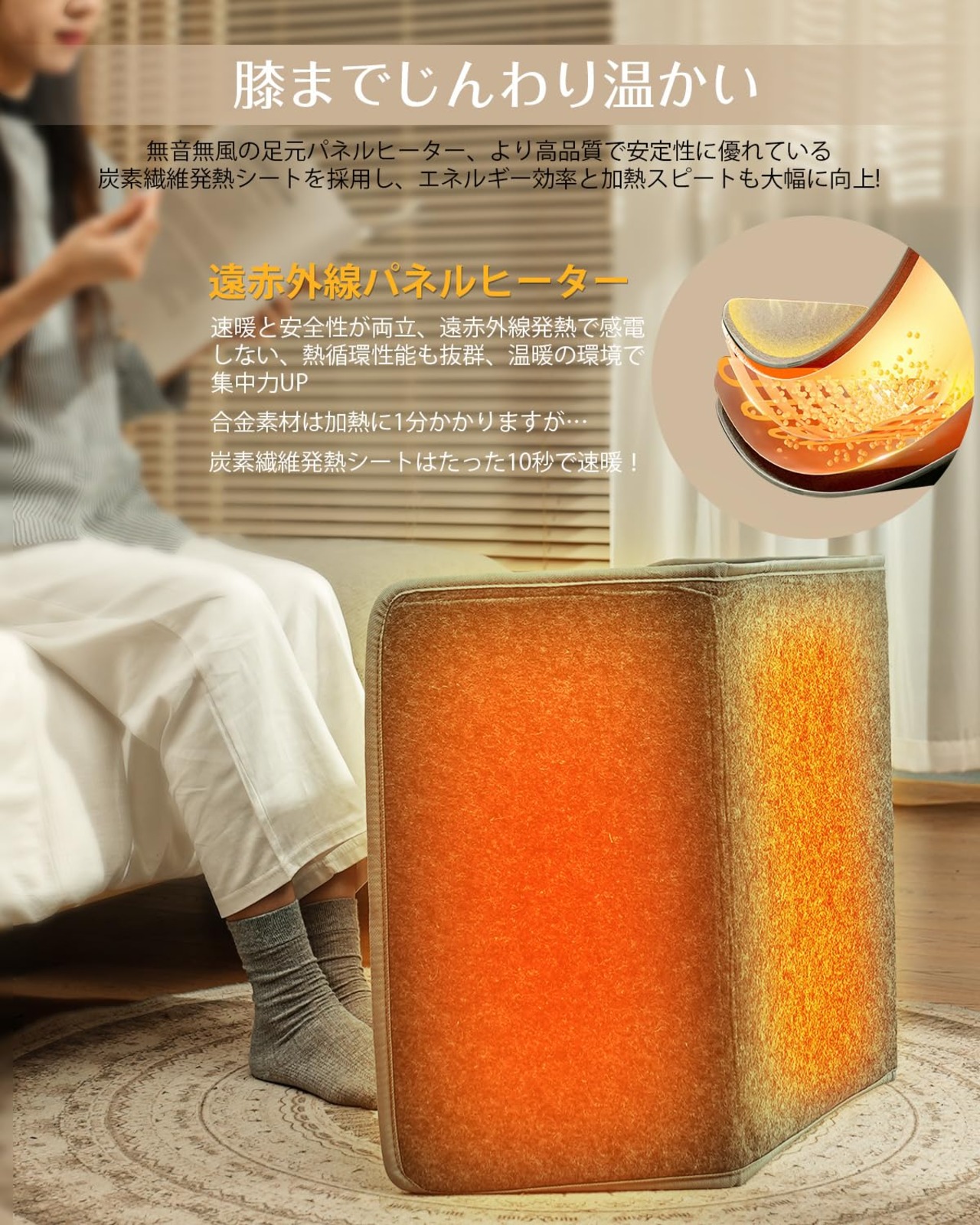 軽量で移動も簡単、収納時はコンパクトに折りたたむことができ、使いたい場所でサッと広げて、無音・無風の快適な暖かさをすぐに実感できる、冬の必需品ともいえる優秀な足元暖房アイテムです。加熱スピードにおいても優れており、電源を入れてからわずか10秒という驚異的な速さで温度が上昇し、暖かさを即座に体感できるため、寒い冬の朝や帰宅直後、短時間しか使用できないタイミングでも、しっかりと暖をとることができ、日常の快適さを格段に高めてくれます。また、通電稼働率はわずか30〜45%と非常に低く抑えられているため、消費電力が少なく、長時間使用しても電気代がかさむ心配がなく、経済的にも非常に優れた設計となっており、節電意識の高いご家庭にもぴったりです。さらに、炭素繊維による遠赤外線の放射率は97%と極めて高く、空気を温めるだけでなく、身体の内側からじんわりと温めてくれるため、暖かさの質がまったく異なり、まるで日差しの中にいるような自然で心地よいぬくもりを得ることができます。