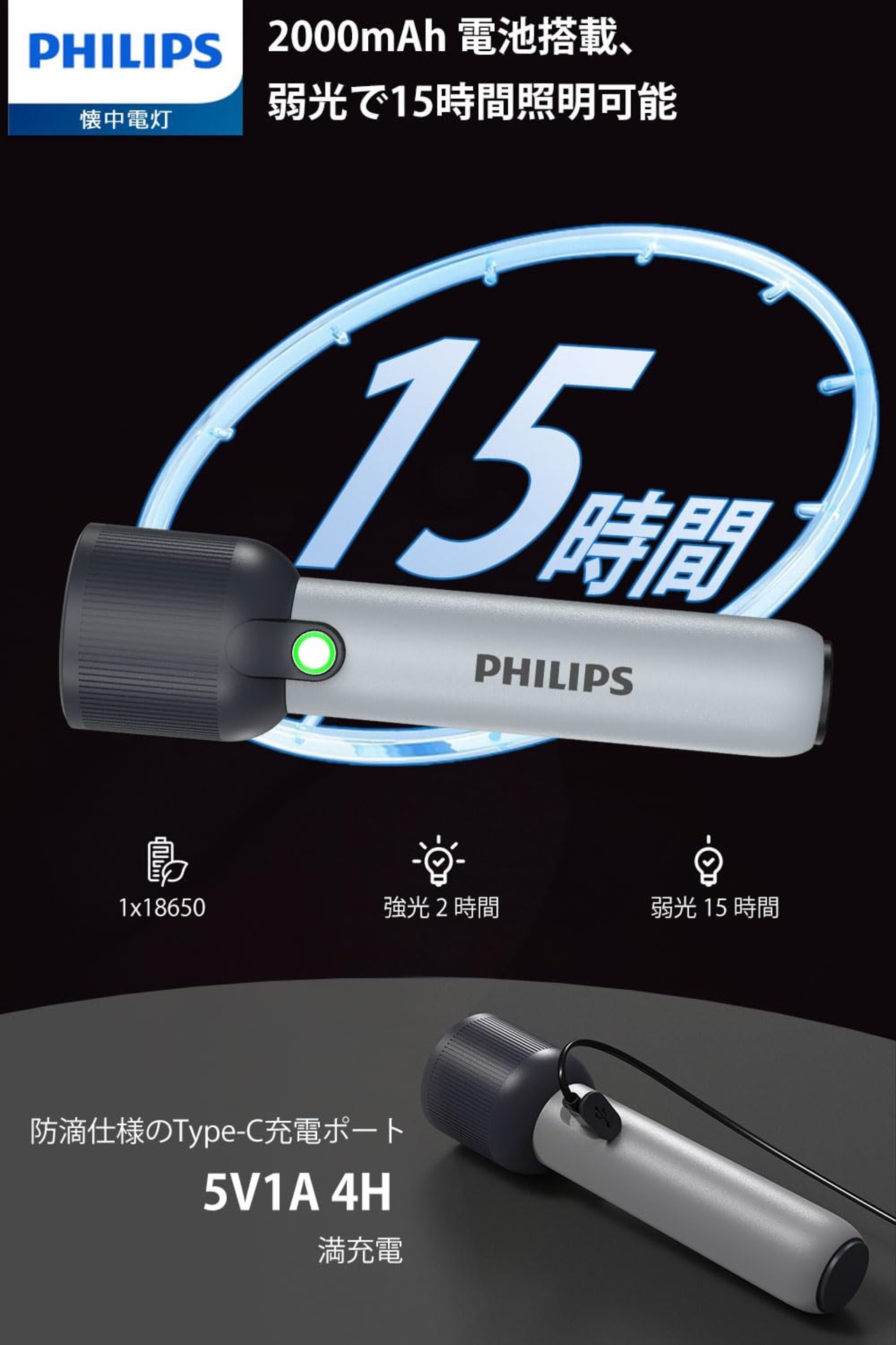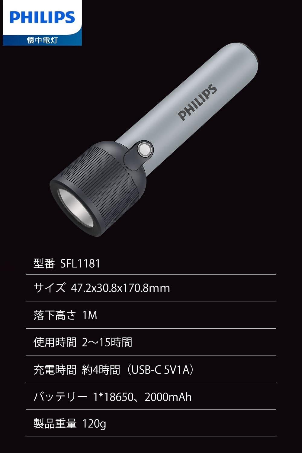 Philips(フィリップス) 小型 led ライト 懐中電灯 高輝度 400ルーメン Type-C 充電式 ハンディ【5つ調光モード/低電量提示/IP44保護/携帯便利】軽量 18650 キャンプ/防災/停電対策 SFL1181