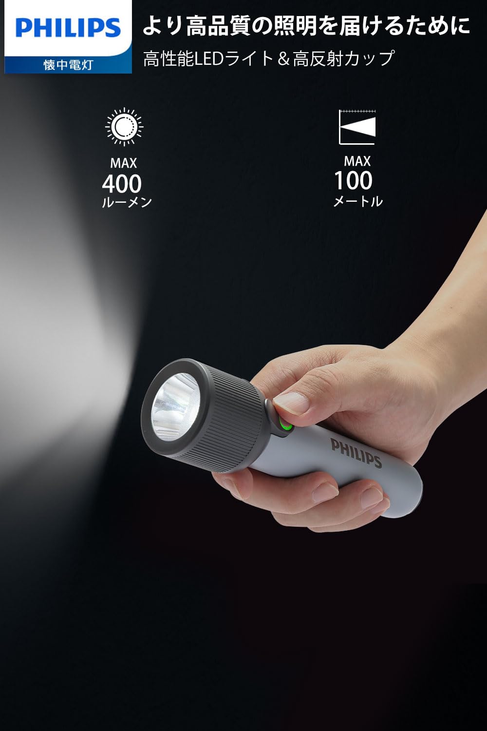 【高輝度LED採用】 高性能のLEDを採用し、最大輝度400ルーメンの明るい光を放ち、最大照射距離は100メートルに達します。暗闇でも広範囲を明るく照らし出すことができます。夜間のアウトドア活動や緊急時の使用に最適です。