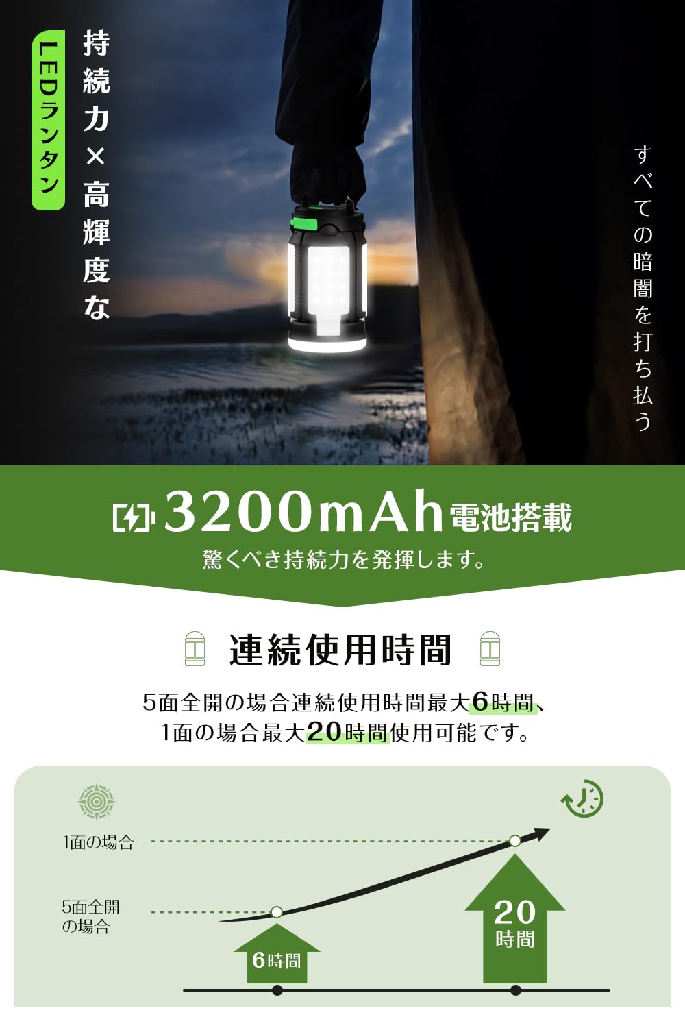 【5面照明 USB充電式キャンプランタン】底部ライトと4つの側面ライト合わせて60個高輝度ledチップを備え、明るさ最大1000ルーメン、5面照明により、前方や周り360°全方位を明るく照らしてくれます。フック付きのLEDランタンなので、テーブル置いたり、手持ちしたり、テント内や木の枝などに吊り下げたり、場面に応じた多様な設置方法が可能、停電時に部屋全体を明るく照らし、キャンプの時にもメインランタンとして使えます。USB充電式の3200mAh大容量で、一回の充電で最大20時間の連続使用が可能です。