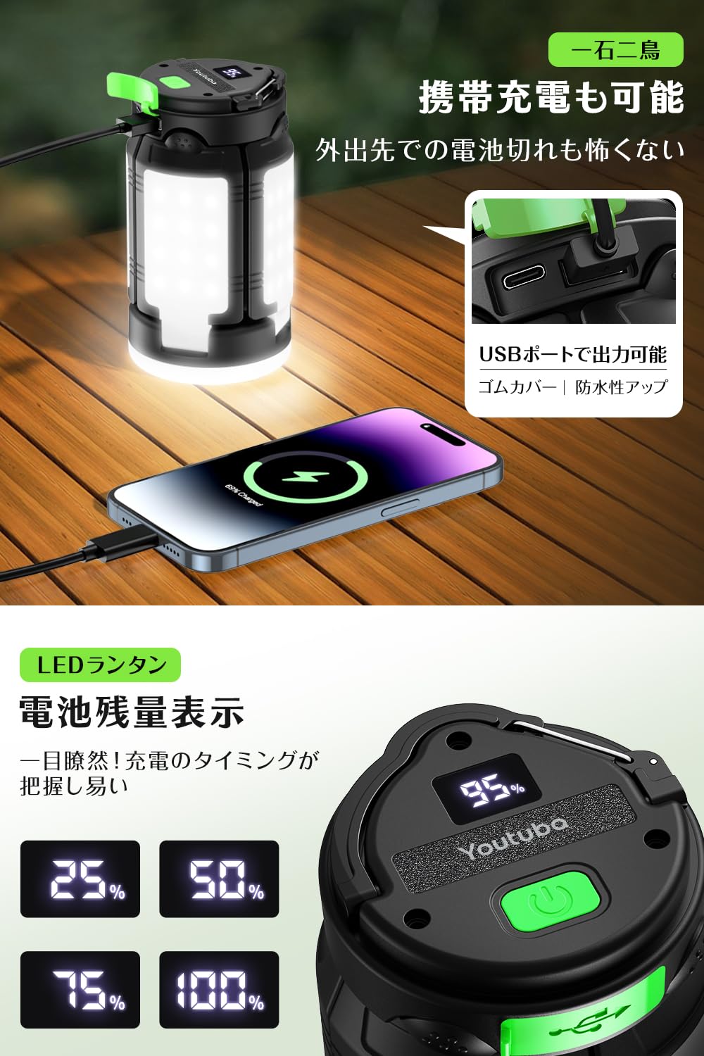 【一台多役 モバイルバッテリー機能付き】ランタン、懐中電灯、日常の作業灯、非常ライト以外にも、スマホへ充電などさまざまなニーズを満たして、使い勝手抜群なアウトドアライトです。USB-A出力ポートが搭載され、スマホやタブレットなどのUSB機器に充電でき、緊急予備電源として利用可能。電池残量がディスプレイ画面に表示され、充電のタイミングが分かりやすい。ワンボタンを押しすることで、簡単に明るさやモードの切替ができ、初めての方でも迷わずに使用できるアウトドアライト。
