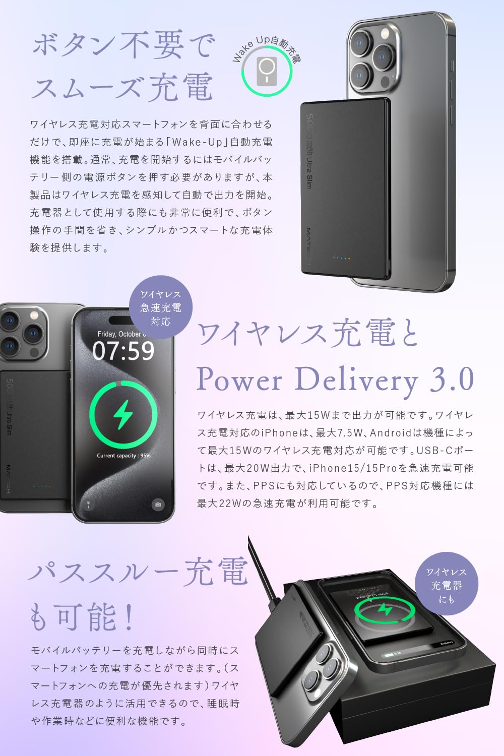 【ボタン不要でスムーズ充電】ワイヤレス充電対応スマートフォンを背面に合わせるだけで、即座に充電が始まる「Wake-Up」自動充電機能を搭載。通常、充電を開始するにはモバイルバッテリー側の電源ボタンを押す必要がありますが、本製品はワイヤレス充電を感知して自動で出力を開始。充電器として使用する際にも非常に便利で、ボタン操作の手間を省き、シンプルかつスマートな充電体験を提供します。