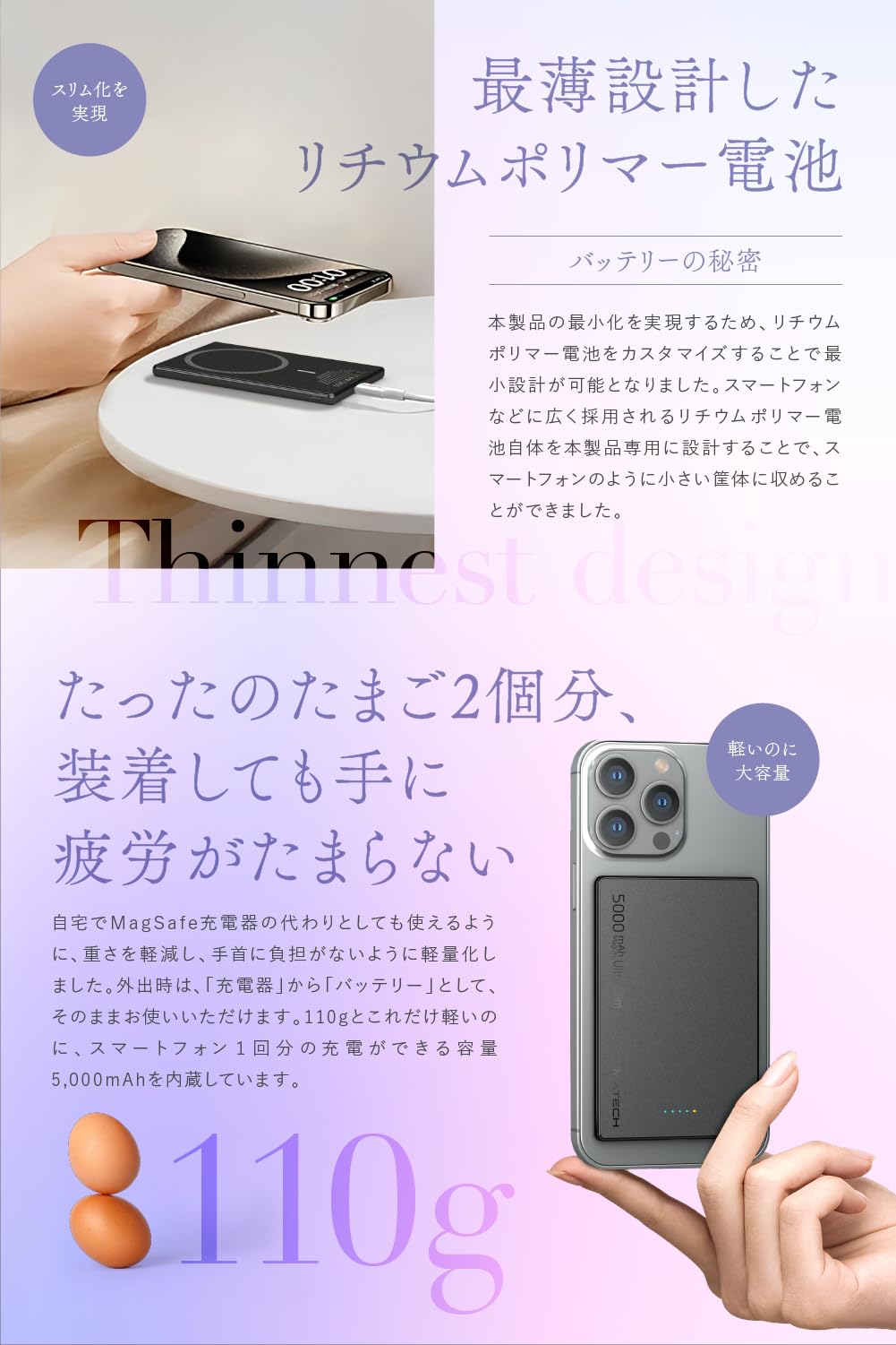 【たったのたまご2個分、装着しても手に疲労がたまらない】自宅でMagSafe充電器の代わりとしても使えるように、重さを軽減し、手首に負担がないように軽量化しました。外出時は、「充電器」から「バッテリー」として、そのままお使いいただけます。110gとこれだけ軽いのに、スマートフォン1回分の充電ができる容量5000mAhを内蔵しています。
