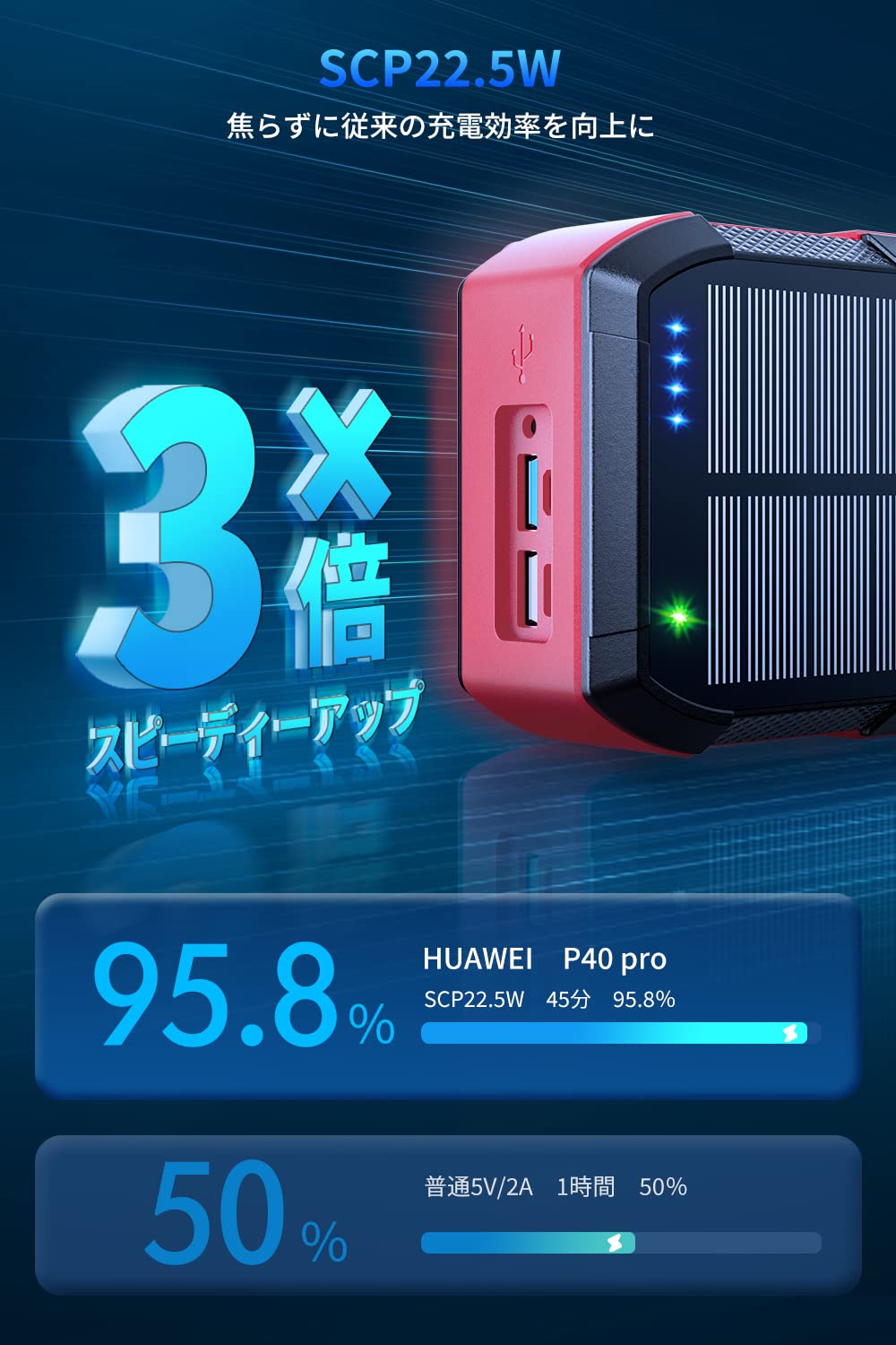 【PD18W/SCP22.5W急速充電 63200mah超大容量】Quick Charge 3.0充電技術を採用したモバイルバッテリー、対応機器に最適な電圧電流値を調節して充電し、充電時間を大幅に短縮。Type-C入出力ポートはPD18W急速充電をサポート、充電速度は従来の2.5倍速、どのタイプのスマホもよりスピーディーな充電が実現されます。さらに、Huawei Super Charge SCP22.5Wにより、充電効率がアップして対応するデバイスを高速充電可能になりました。圧倒的な63200mAh超大容量バッテリー、スマホやタブレット、携帯扇風機、ゲーム機などUSB機種に何回も充電可能、アウトドアに最適。