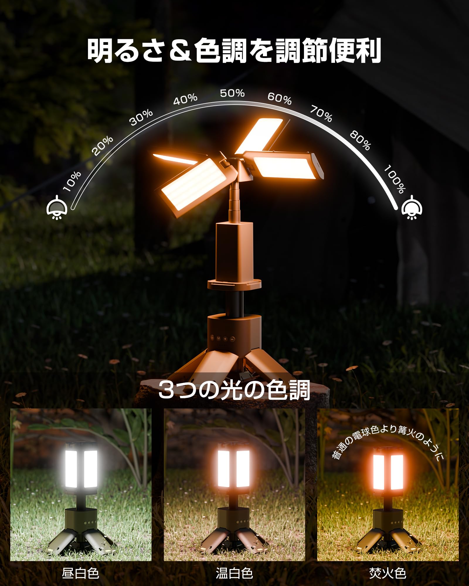 【ライトの光色と明るさを自由に調節可能】このランタンは、電球色・昼白色・温白色の3パターンの光色から選択可能で、シーンに応じて最適な雰囲気を作り出します。キャンプ愛好者の意見により、電球色を焚き火の色に設計しているため、明火を使わなくても焚き火の雰囲気を楽しむことができます。ランタンの明るさも10段階調節可能(ボタンを長押しすると無段階調節も可能)で、キャンプやバーベキューの夜を温かく照らしたり、読書や作業のために明るい光を提供したりと、用途に応じて最適な輝度を設定できます。