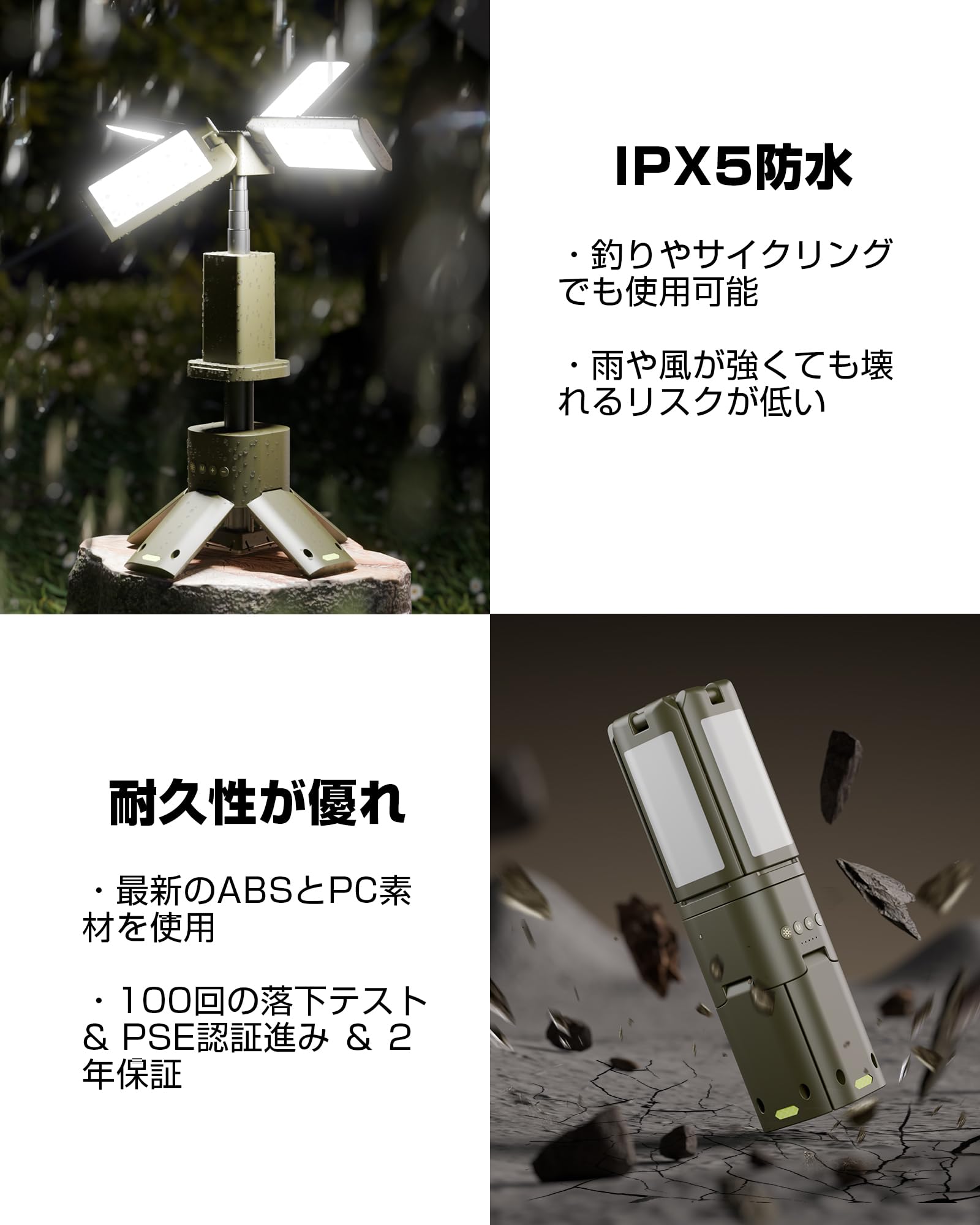 【IPX5防水&高い耐久性&安心保障】IPX5防水設計で、キャンプや釣りなど様々なアウトドアシーンにて安心してご使用いただけます。️KOJIHOMUキャンプランタンは2年間の保証が付いています。初期不良や故障が発生した場合は、保証期間内であれば無料で修理や交換を行いますので、お気軽にご連絡ください。