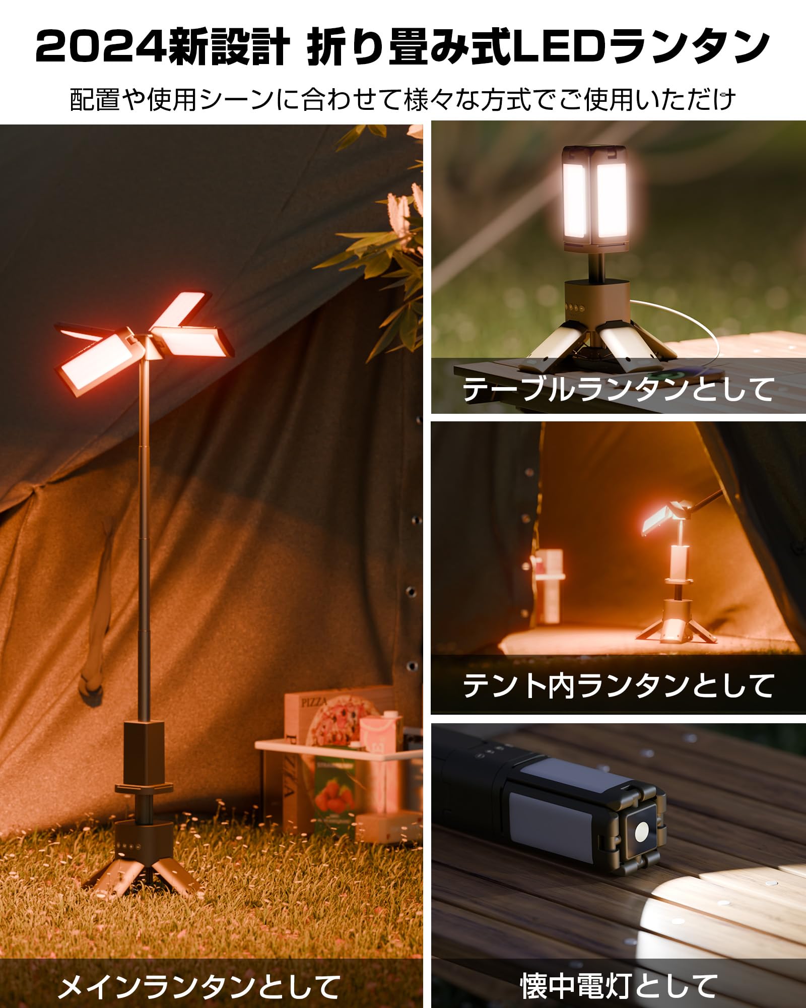 【折りたたみ式LEDランタン・720°全方向配光】折りたたみ式のデザインで、持ち運びや収納が非常に便利です。使用時にはランタンの高さを29cmから111cmまで調整可能で、卓上でも床でも様々な場所に対応できます。4枚のLEDパネルは上下180°&左右270°調節可能で、使用時には720°全方向に光を届けることができ、広範囲を均一に明るく照らします。キャンプサイト全体や大きな部屋でも、このランタン一つで十分な明るさを提供できます。