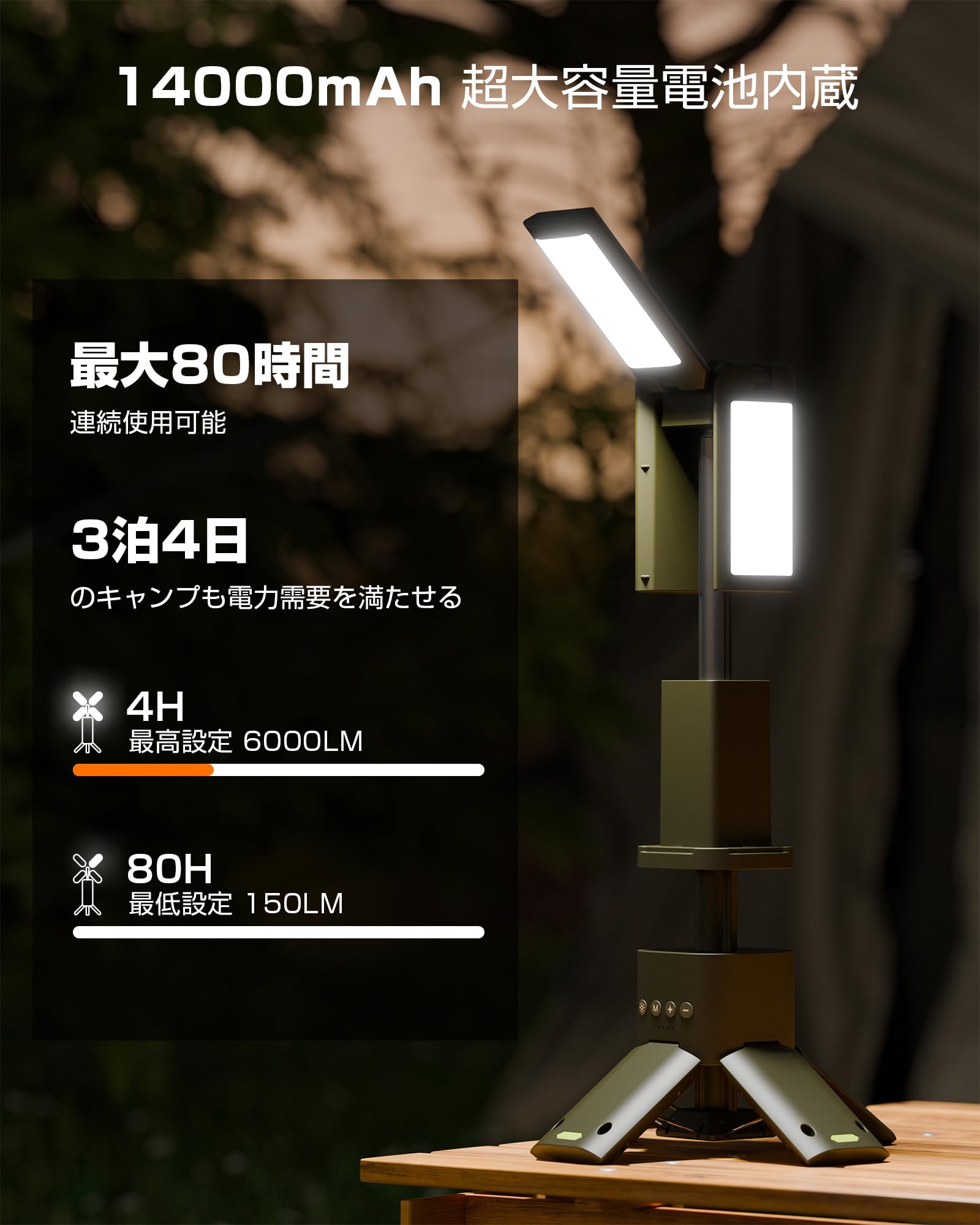 【14000mAh大容量電池内蔵・最長80H連続使用可能】14000mAhの超大容量バッテリーを搭載し、最長で80時間の連続使用が可能です。長時間のアウトドア活動や非常時でもバッテリー切れを心配することなく、安定した明かりを提供します。
