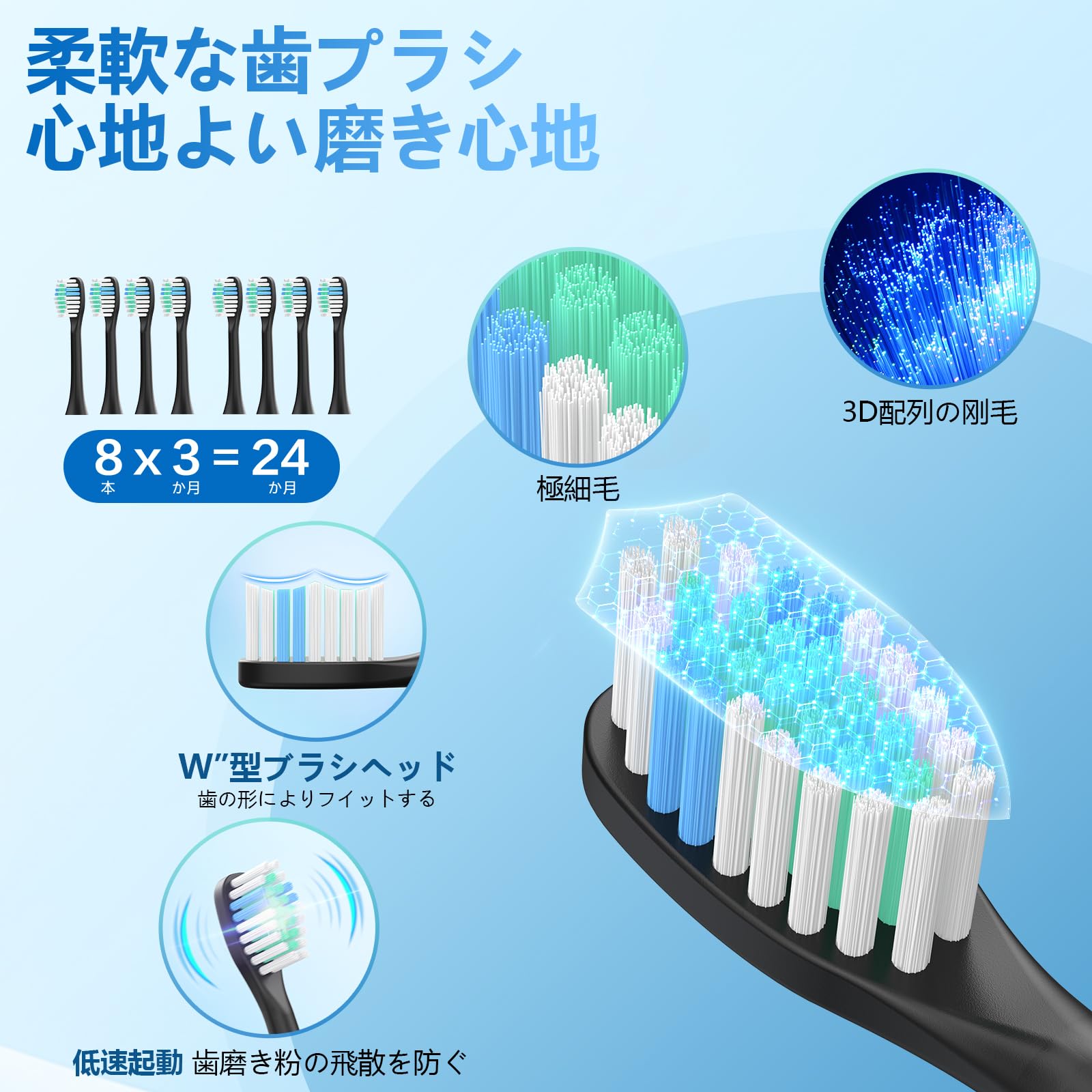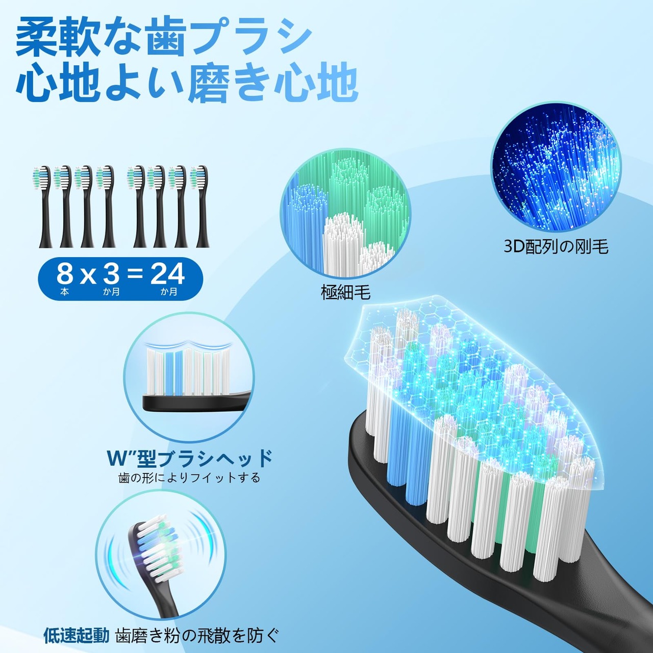 電動歯ブラシ 音波式 電動ハブラシ横振り IPX7防水 6モード音波歯ブラシ 替えブラシ8本付 充電式 収納ケース付き 2分間オートタイマー機能 携帯便利 旅行 T3