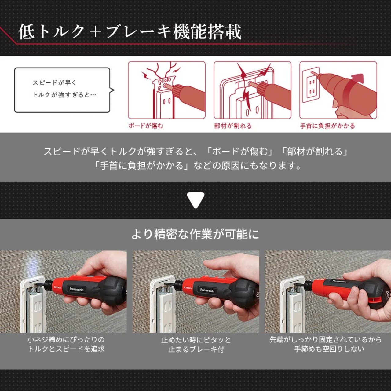 ●低トルク+ブレーキ機能搭載で、より精密な作業が可能になっています。