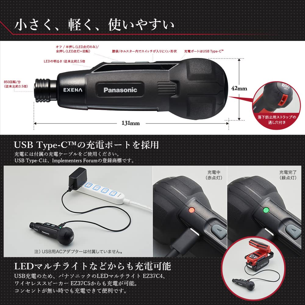 パナソニック(Panasonic) 電動ドライバー USB Type-C 充電式 3.7V 850mAh 正転・逆転 手締め機 ブレーキ付 LEDライト ビットセット USB充電ケーブル付属 軽量 小型 ネジ締め DIY 電動工具 充電ミニドライバー EZ1D11S-R レッド