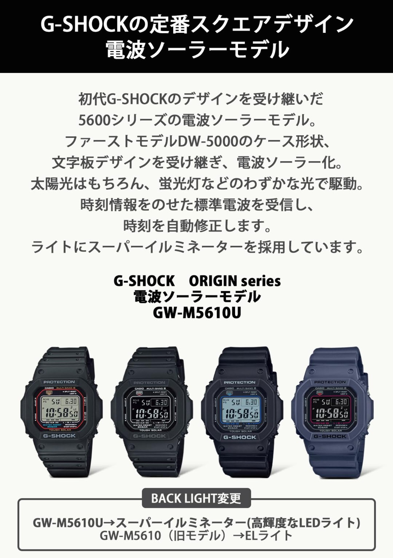 1983年に誕生したDW-5000Cのデザインを継承しているスクエアフェイス5600シリーズの、マルチバンド6搭載モデルです。 ファーストモデルDW-5000のケース形状、文字板デザインを受け継ぎ、クラシカルなデザインとしました。タフネスをコンセプトに進化を続けるG-SHOCKの中で、ファーストモデルのDNAを受け継ぎ、更に進化したモデルです。