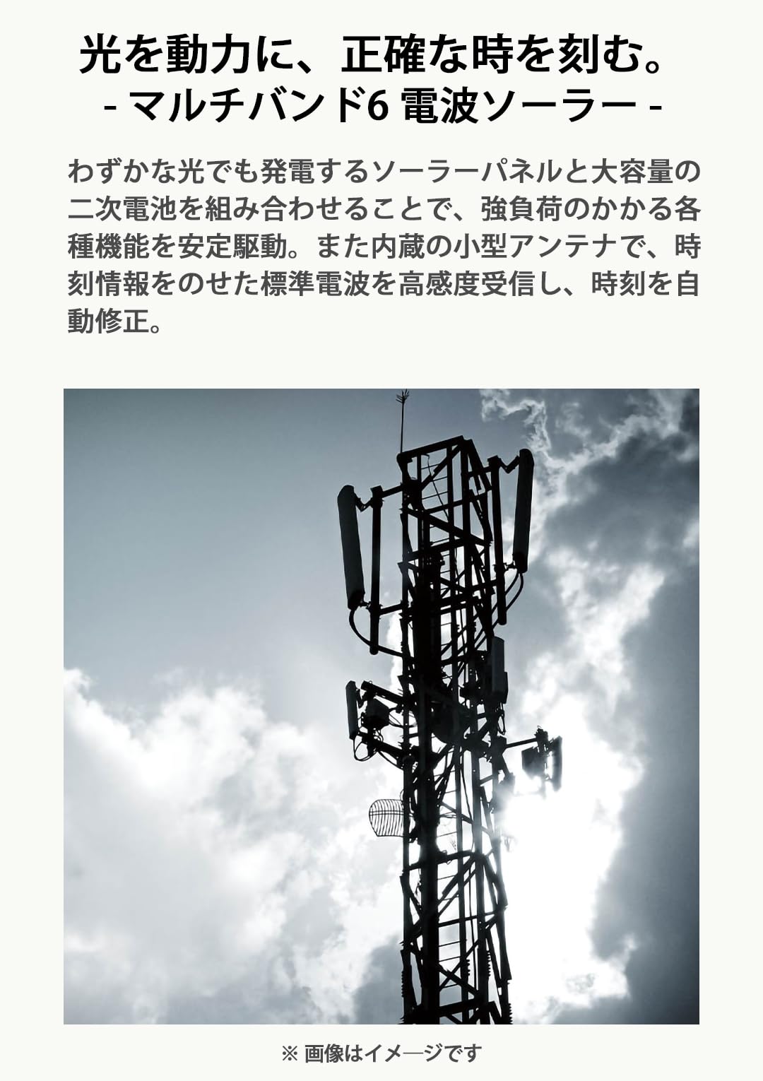 ●電波受信機能:自動受信(最大6回/日)(中国電波は最大5回/日)<日本>受信電波:JJY、周波数:40kHz/60kHz(福島 /九州両局対応モデル )<北米地域>受信電波:WWVB、周波数:60kHz <ヨーロッパ地域>受信電波:MSF/DCF77、周波数:60kHz/77.5kHz <中国>受信電波:BPC、周波数:68.5kHz *ホームタイム設定を受信可能な都市に設定すると、都市に合わせた局を受信します。尚、時差は設定された都市によって設定されます。