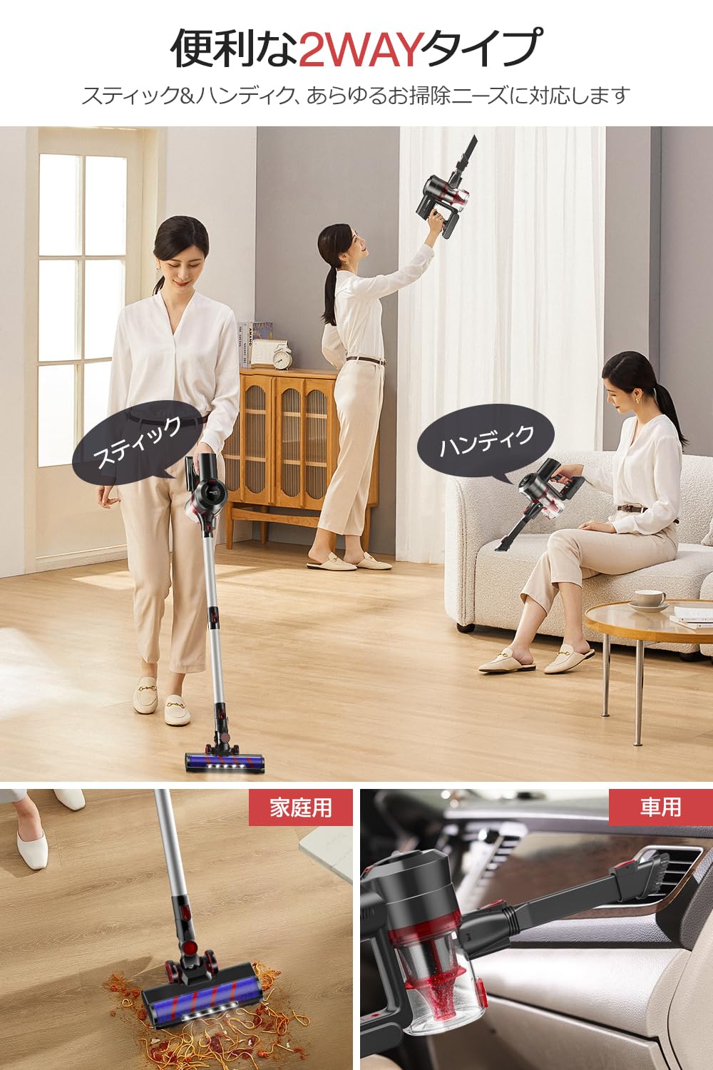 【75分連続稼働 スティッククリーナー】内蔵された大容量バッテリーにより、この掃除機は一回の充電で最大75分間の連続使用が可能です。広い範囲を一度に掃除できるため、200平方メートルの広さも問題なし。バッテリーは取り外し可能で、充電も非常に簡単。予備のバッテリーを用意すれば、長時間の掃除も中断することなく続けられます。広い家でも効率的に掃除ができ、頻繁に充電する手間を省けます。家族全員が簡単に使用できるこの掃除機は、これまでにない自由度と便利さを提供し、家中をきれいに保つための理想的なパートナーとなるでしょう。スティッククリーナー、車用掃除機としても多用途に活用できます。