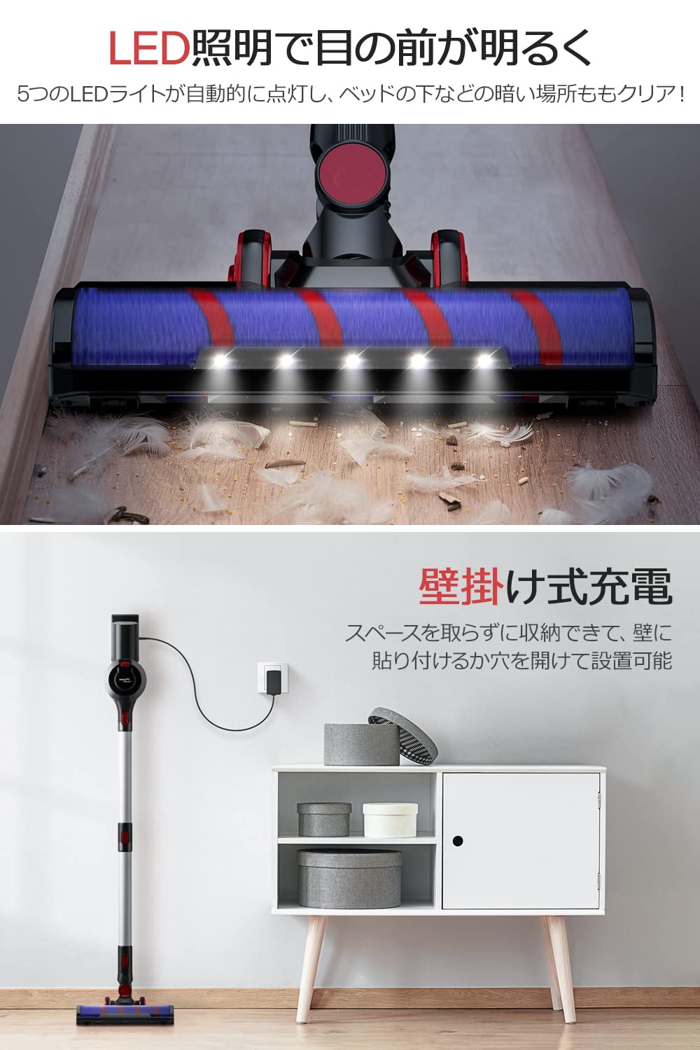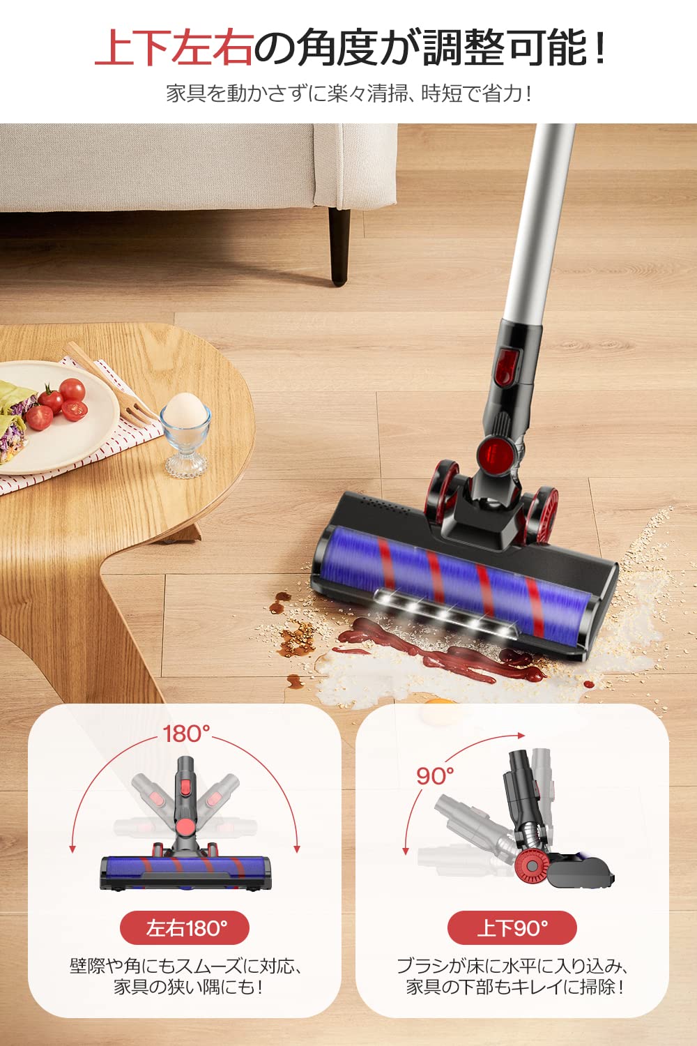 【電気掃除機 左右180°上下90°回転】このコードレス掃除機は、180°の左右回転と90°の上下回転が可能。狭い隙間や家具の下など、掃除が難しい場所でも簡単に清掃できます。さらに、5つの明るいLEDライトが装備されており、暗い角落ちやベッドの下などの隠れたホコリも見逃しません。家全体を徹底的に掃除でき、どんな細かなゴミも見逃すことはありません。掃除が終わった後も、家中がピカピカに保たれます。ヘッドの操作性が非常に高いため、掃除機が重く感じることなくスムーズに動かすことができます。掃除がストレスフリーに行えるように設計されています。