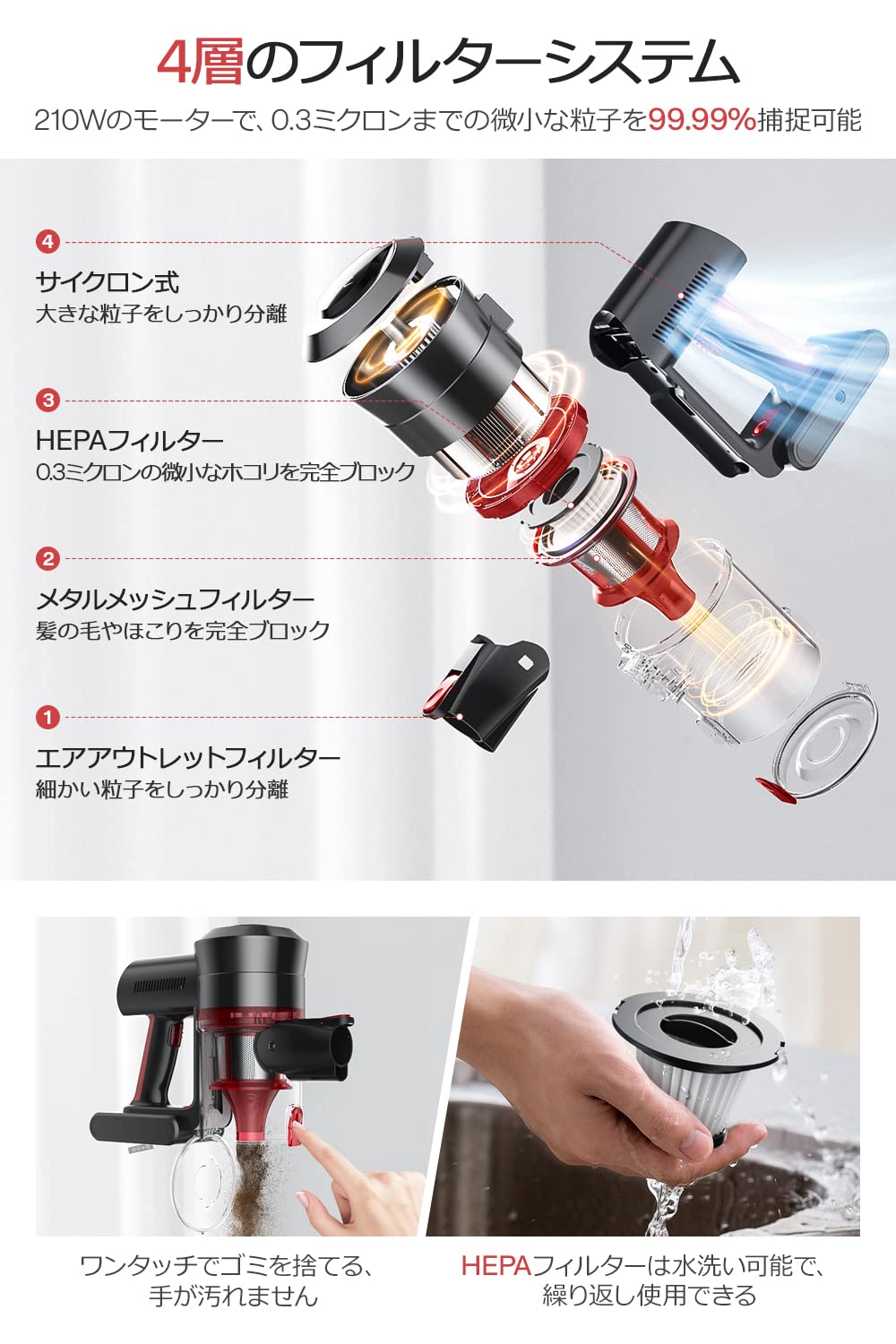 【多重濾過 コードレスクリーナー】多重フィルターシステムを採用し、99.99%の高いフィルター効率で空気中の微細なホコリやアレルゲンを捕捉。高性能なHEPAフィルターにより、ミクロン単位の小さな粒子まで確実にキャッチし、排出される空気は常にクリーン。フィルターは取り外して水洗いできるため、いつでも清潔な状態を保てます。さらに、550mlの大容量ダストカップを備えており、頻繁にゴミを捨てる手間を省けます。複数の部屋を一度に掃除することが可能です。強弱2段階の吸引力調整ができ、掃除する場所やゴミの量に応じて最適な吸引力を選べます。充電スタンドも付属し、使わない時はコンパクトに収納できるため、場所を取らず便利。