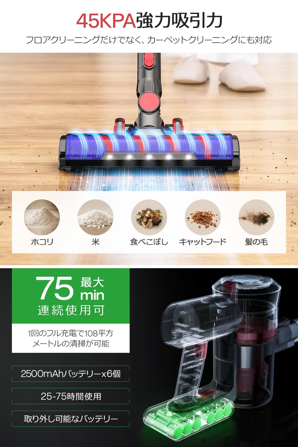 掃除機 コードレス 【2025進級版&45000pa超強力吸引&75分連続稼働】 LCD液晶ディスプレイ 壁掛けブラケット&アダプター付き コードレス掃除機 サイクロン スティッククリーナー ハンディクリーナー 2WAY 左右180°上下90°回転 HEPAフィルター 多重濾過 LEDライト5つ付 着脱式バッテリー 伸縮型パイプ 強弱2段階モード PSE認証済 母の日 父の日 プレゼント