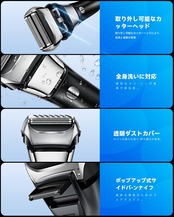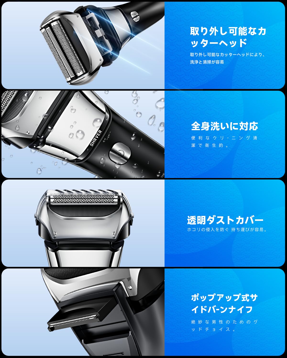 【乾湿両用設計&IPX7 防水仕様】この電動シェーバーは乾湿両用設計で、湿らせて剃るのが好きな方でも、乾いた状態で剃るのが好きな方でも快適に使用できます。IPX7 防水仕様を備えており、全体洗浄が可能で、常に清潔な状態を保つことができます。刃先は簡単に取り外せるので、清掃もしやすいです。