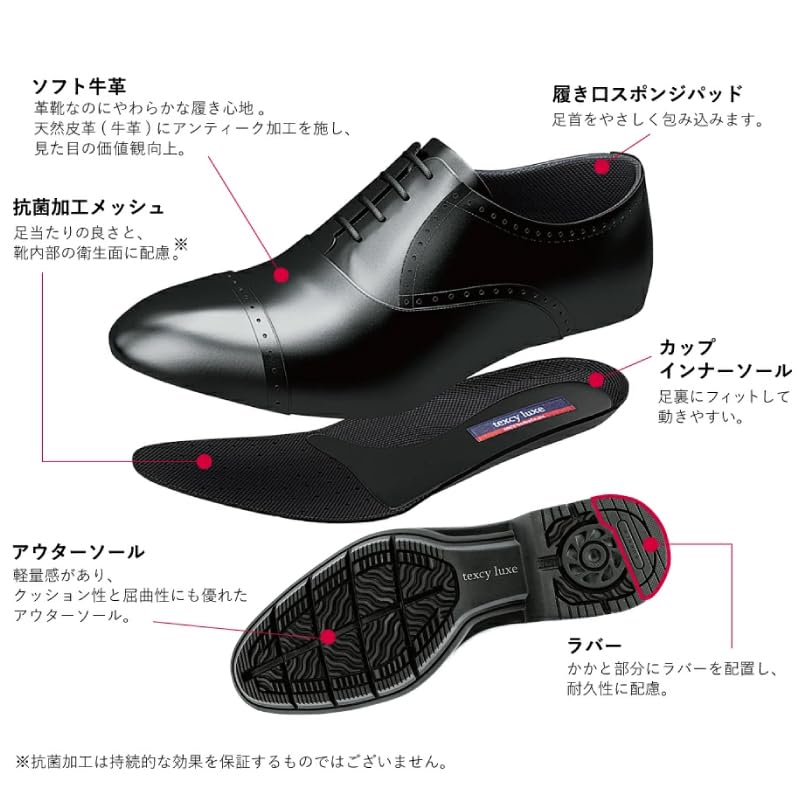 amazonビジネスシューズランキング第1位獲得(2017年,2018年)のTU-7774をシンプルなストレートチップなデザインにしました。カラーバリエーションも増やして様々なスタイルに対応できます! 商品特徴①幅広3E相当 ②クッション性と屈曲性に優れ、軽量感のあるE.V.A.インジェクションソール採用 ③かかと部にラバーを採用し、耐久性に配慮 ④靴内環境を快適にするために、ライニング材に抗菌繊維を採用(JIS L1902:菌液吸収法) ⑤成型E.V.A.インナーソール採用 ⑥天然皮革(牛革)にアンティーク加工を施し、見た目の価値観向上