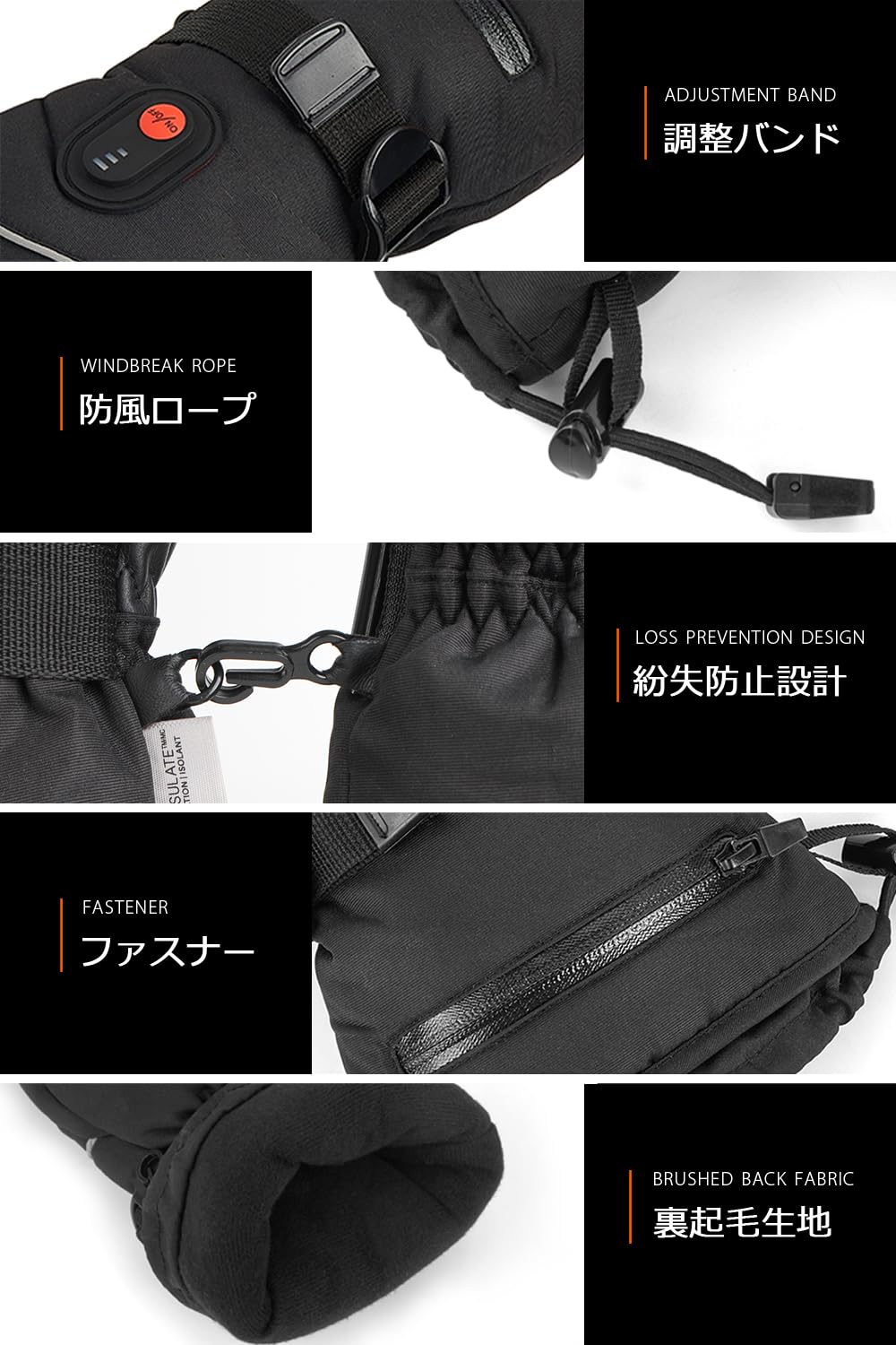 【機能性抜群・防水&防寒&防風電熱グローブ】高品質な綿とPU皮革の手のひらは、優れた振動防止効果を持っています。多層で高密度な生地は、風や寒さから守る効果が高く、バイクやスキーなどのスポーツに最適です。(※完全防水ではないのでご注意ください)グローブの手首には、内蔵された弾性ゴムと、調節可能なニットベルトが採用されており、緩みを自由に調節でき、体に不快な圧迫を与えることはありません。
