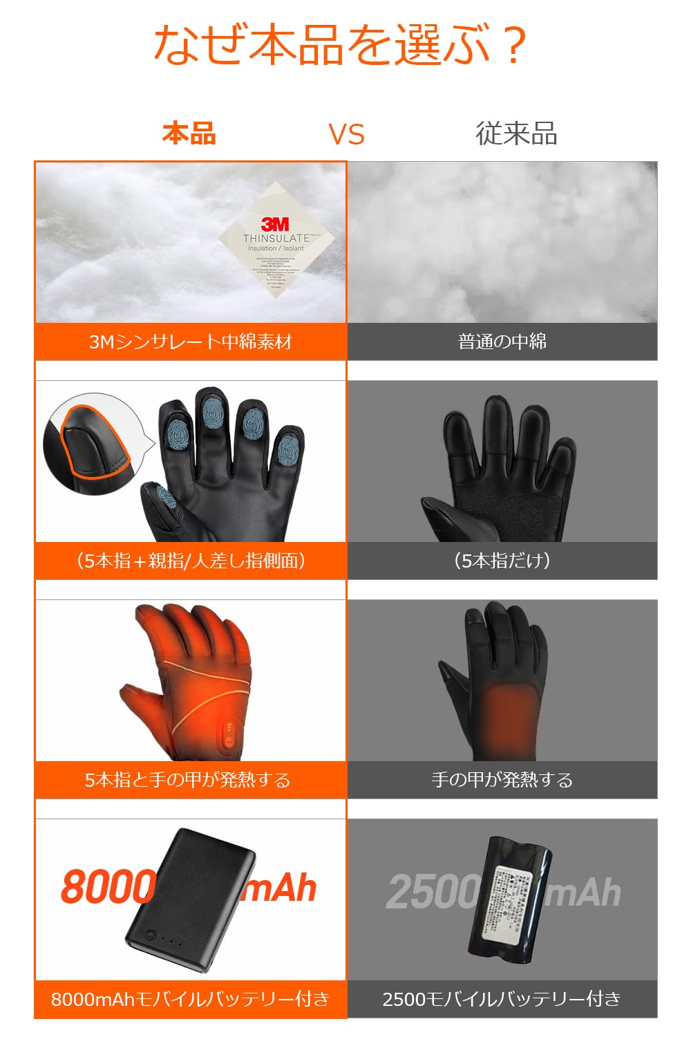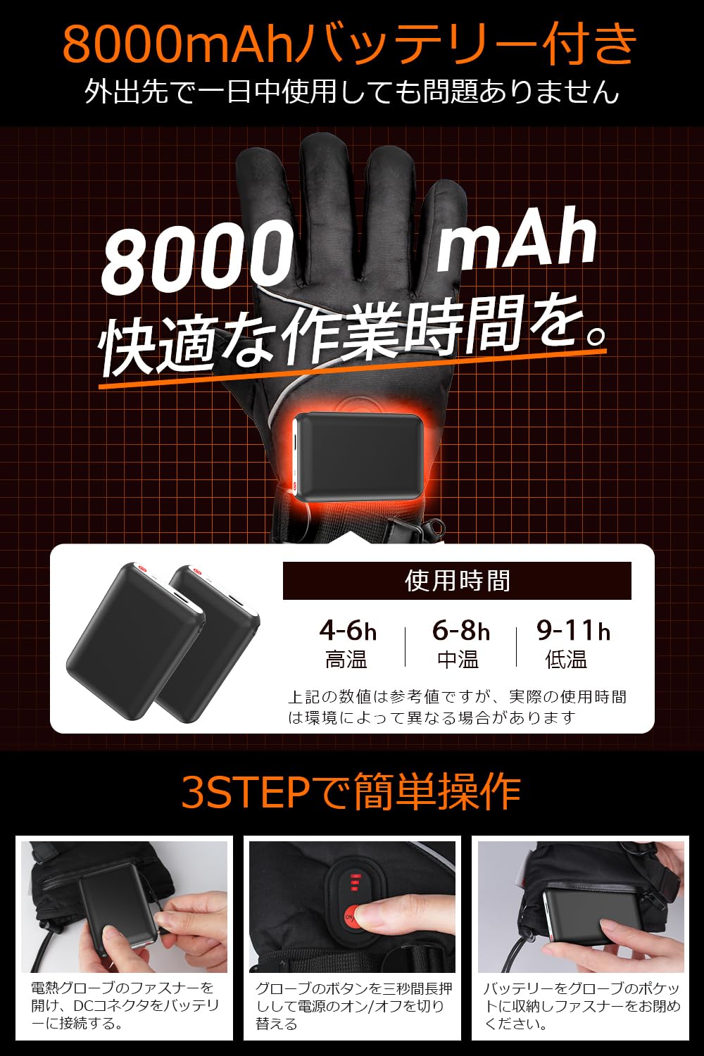 【冬の必需品 & プレゼントにぴったり】冬には、登山やスキー、バイクや自転車、釣りなどのアウトドア活動や通勤・通学・外出時に幅広く電熱グローブが使われています。家族や友人、恋人、または自分用として最適なプレゼントですので、ぜひご利用くださいませ。電熱グローブ本体*1、8000 mahリチウム電池*2、TypeC充電ケーブル*1。