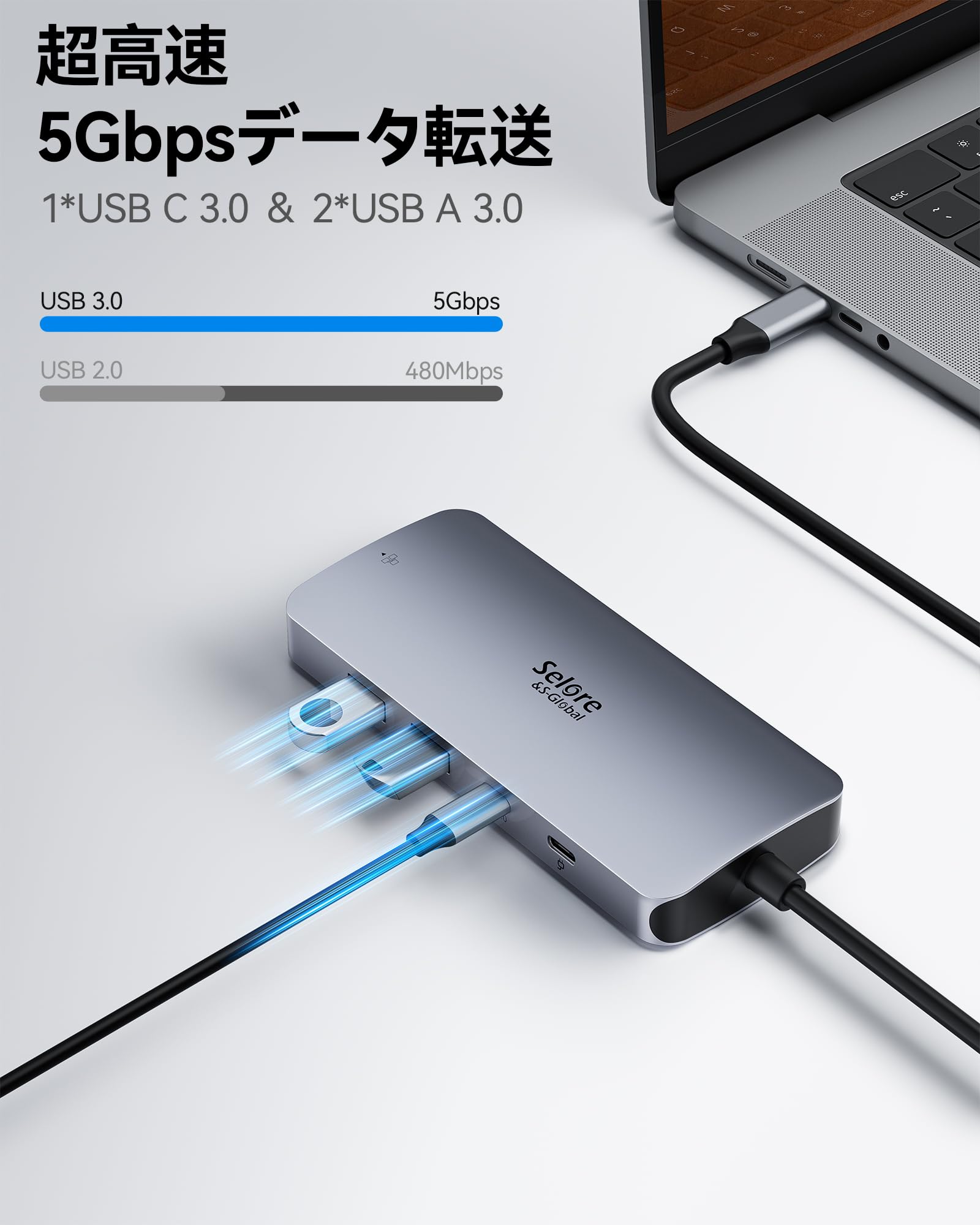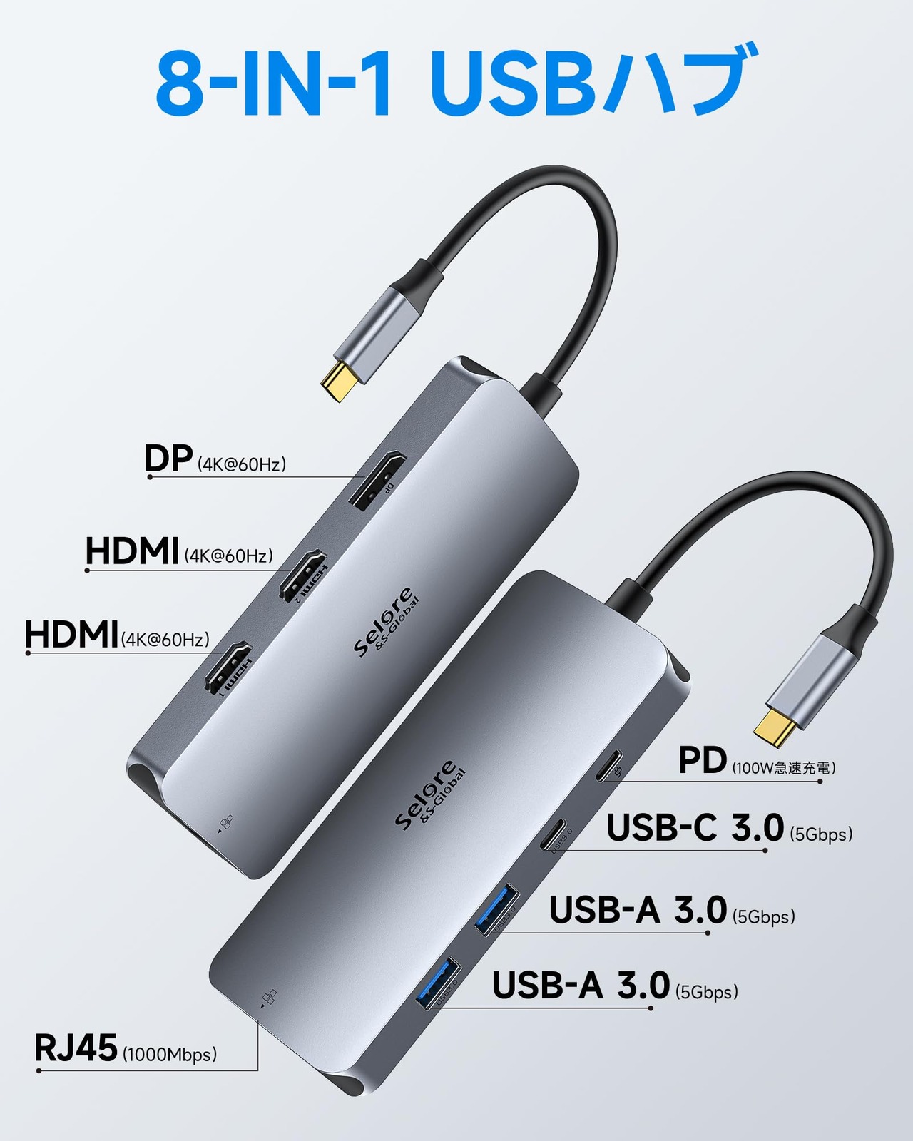 【2022最新】【マルチモニター 3画面拡張 2つHDMI+DP+LAN 】Selore 8in1ドッキングステーション hdmi 2つ 4K対応 3画面出力 モバイルタイプ 100W 急速充電 Displayport LAN 2 USB-A/USB-C 3.0ポート usb ハブ type-c MacBook Pro/Air 2020 Dell/Lenovo Yoga HPなどタイプC機種に対応 | ニコニコSHOP
