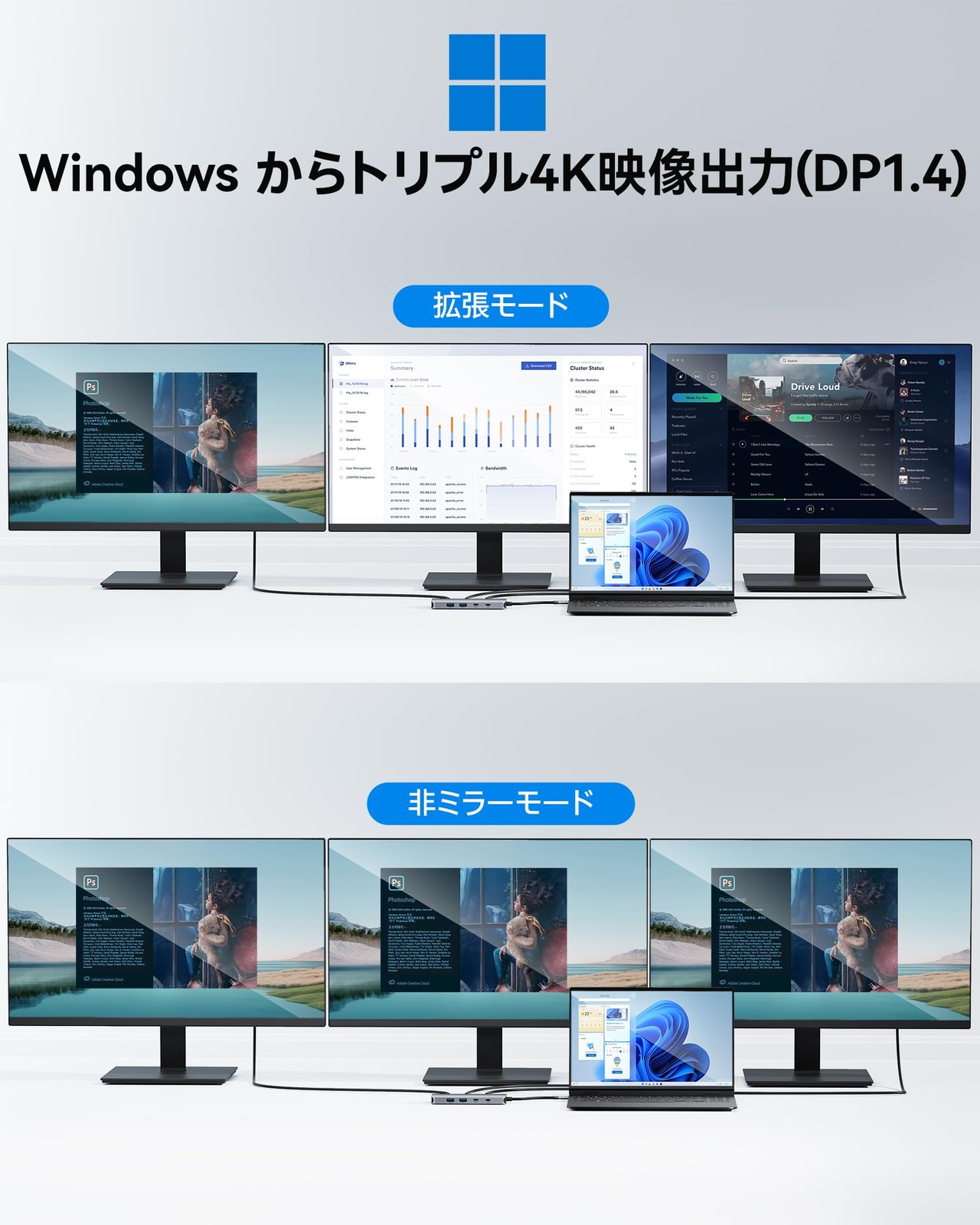 【最大3台のデスプレイに4K高精細映像出力】HDMIポート×2とDisplayPort×1で最大3画面出力可能なUSB Type-Cドッキングステーション 3画面出力。モニターを使って大画面で作業をしたり、USBメモリでデータをやり取りしたりすると、ポートが不足しがちになります。このマルチモニター 3画面ドッキングステーションを使うことで、モニターを増やしたり、周辺機器をよりパワフルに使えたりするようになります。【ご注意】:①、4K/60Hzを利用するには、PCがDPort 1.4 Alt Modeに対応必要。②、PCはIntel第10世代以前のプロセッサーの場合は、2つのディスプレイを拡張しかできません。③、MAC接続時のご注意:この製品はMACの外部モニター2台以上の拡張モードをサポートしていません