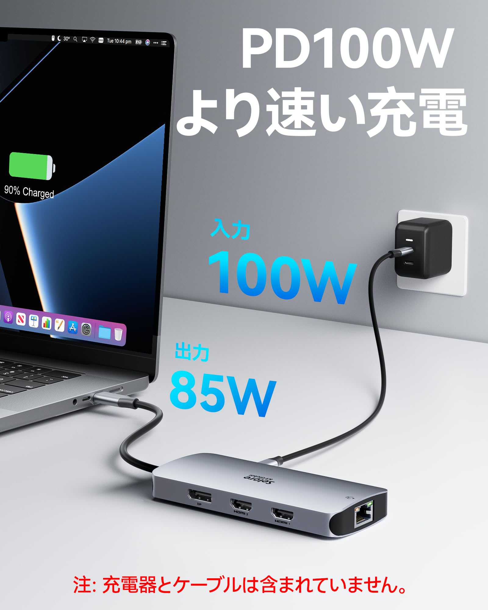 USB PD100W対応 最大85W給電が可能, マルチモニター 3画面拡張, MacBook等のPCと一体感ある美しいデザイン, 対応ディスプレイに4k超高画質で出力, LANポートがついて、ギガビット対応