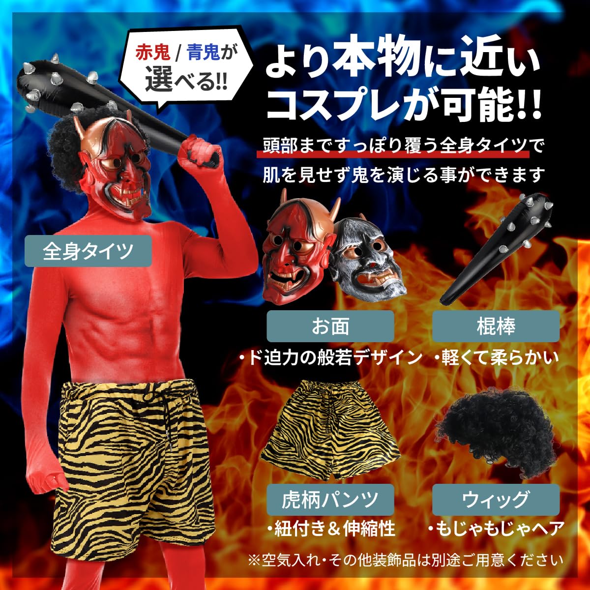 【セット内容】全身タイツ×1点・虎柄パンツ×1点・お面×1点・ウィッグ×1点・棍棒×1点 【サイズ(約)】全身タイツ:フリーサイズ 虎柄パンツ:ウエスト61cm~116cm(ゴム紐でサイズ調節可能)/丈40cm お面:26cm×16cm ウィッグ:頭囲48cm 棍棒:70cm×15cm 【カラー】レッド・ブルー※お好みのカラーをお選びいただけます。素材:ポリエステル