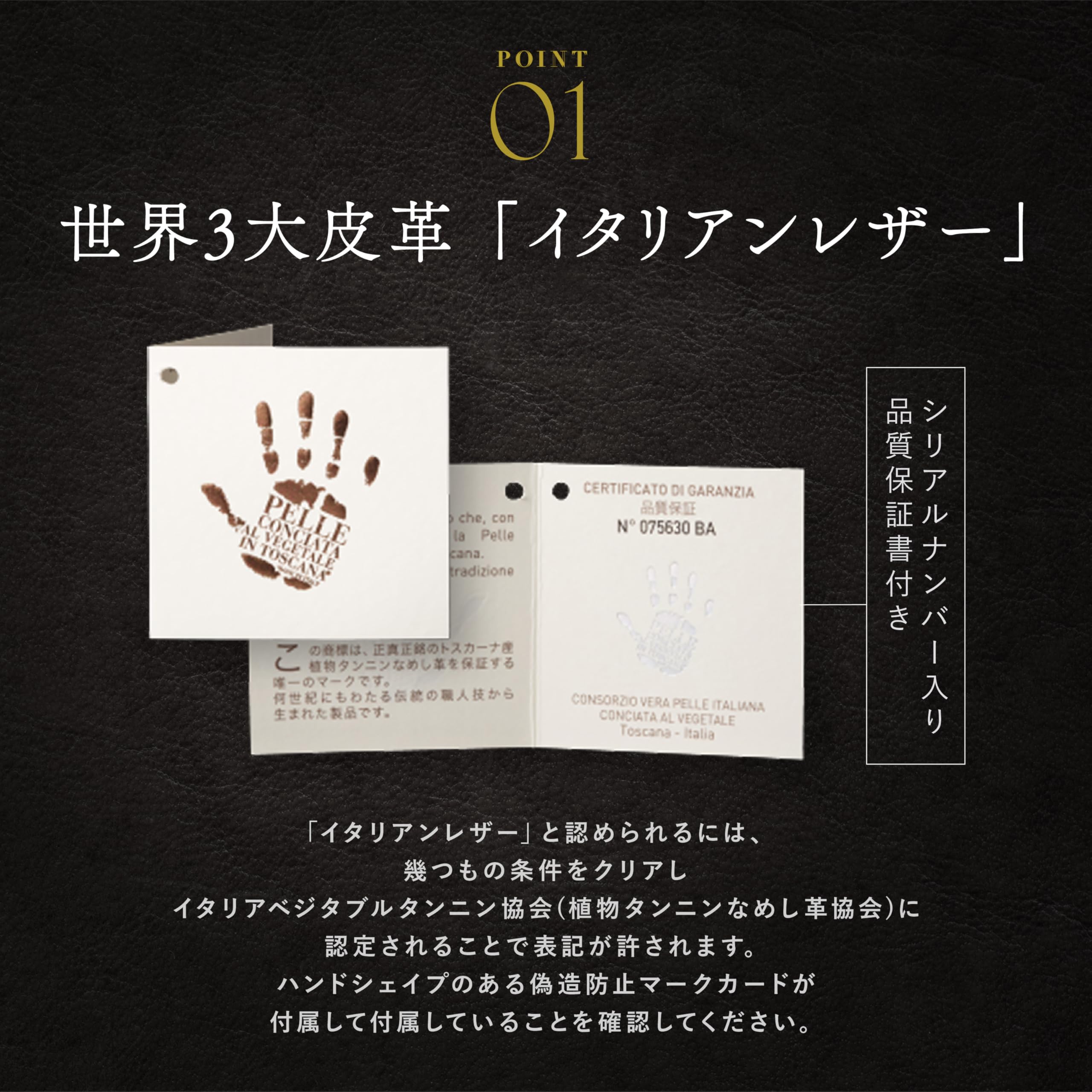【素材へのこだわり】世界最高峰の一流皮革"イタリアンレザー"の中でも、伝統的な王道のイタリアンレザーが最大限に味わえると評価されているテンペスティ社の「エルバマット」という品種を使用しています。コストのかかる伝統製法(特許技術)と北欧産の最高級牛皮の希少部位のみを贅沢に使用した逸品は、ビジネス・カジュアルなシーンを優雅に演出し、幅広い年齢層にご支持を頂いております。