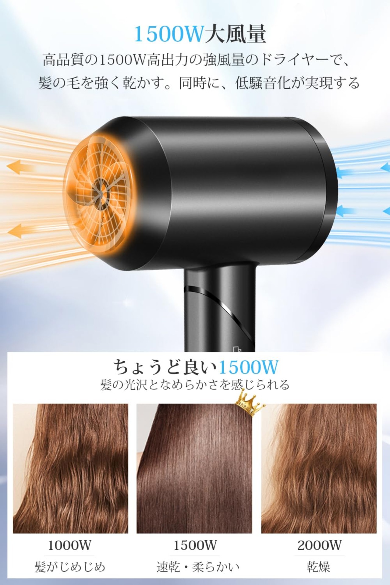 ▶ 【強力な速乾性能と優れたヘアケア機能】 1500W のパワフル大風量のヘアドライヤー により、長髪でも数分間で素早く乾かせ、忙しい朝の準備時間を大幅に短縮します。高性能省エネモーター ドライヤーが安定した気流を発生し、入浴後の髪乾燥時間を大幅に短縮します。併せて、57℃恒温モードが内蔵温度センサーにより風温を一定に保ち、熱ダメージを最小限に抑えます。髪に均等に風を当てることで、キューティクル保護やカラー退色抑制にも貢献します。省エネ設計で電気代も抑えられ、家計にも優しい高性能モデルです。