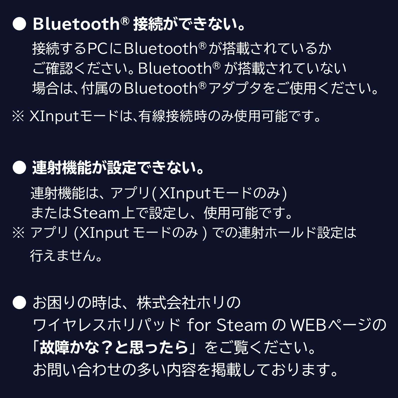 【ご注意】 ・ PCおよびSteam Deckのシステムソフトウェアによっては全ての機能がお使いいただけない場合があります。 その場合は、最新のシステムソフトウェアにバージョンアップしてからご利用ください。 ・ XInputは、有線接続時のみ使用可能です。 ※ 本品は以下の機能を搭載しておりません。 これらの機能を使用するゲームでは快適にプレイすることができません。 ・ 振動機能 ・ トラックパッド ・ヘッドフォンジャック 【内容品】 ・コントローラー × 1 ・USBケーブル(Type-A to Type-C) × 1 ・Bluetoothアダプタ(USB Type-A) × 1 ・取扱説明書 × 1 【ご注意・その他】 ※ 写真と本品は多少異なる場合があります。 ※ 本品の仕様および外観は改良のため予告なく変更することがありますのでご了承ください。 ※ 記載されている機能以外は搭載しておりません。 ※ 内容欄に記載されているもの以外は含まれておりません。 2024 Valve Corporation. Steam、Steam Deck及びSteamロゴは、米国及びまたはその他の国のValve Corporationの商標及びまたは登録商標です。 ● その他の全ての商標に関する権利は、それぞれの権利所有者に帰属します。 HORI CO., LTD