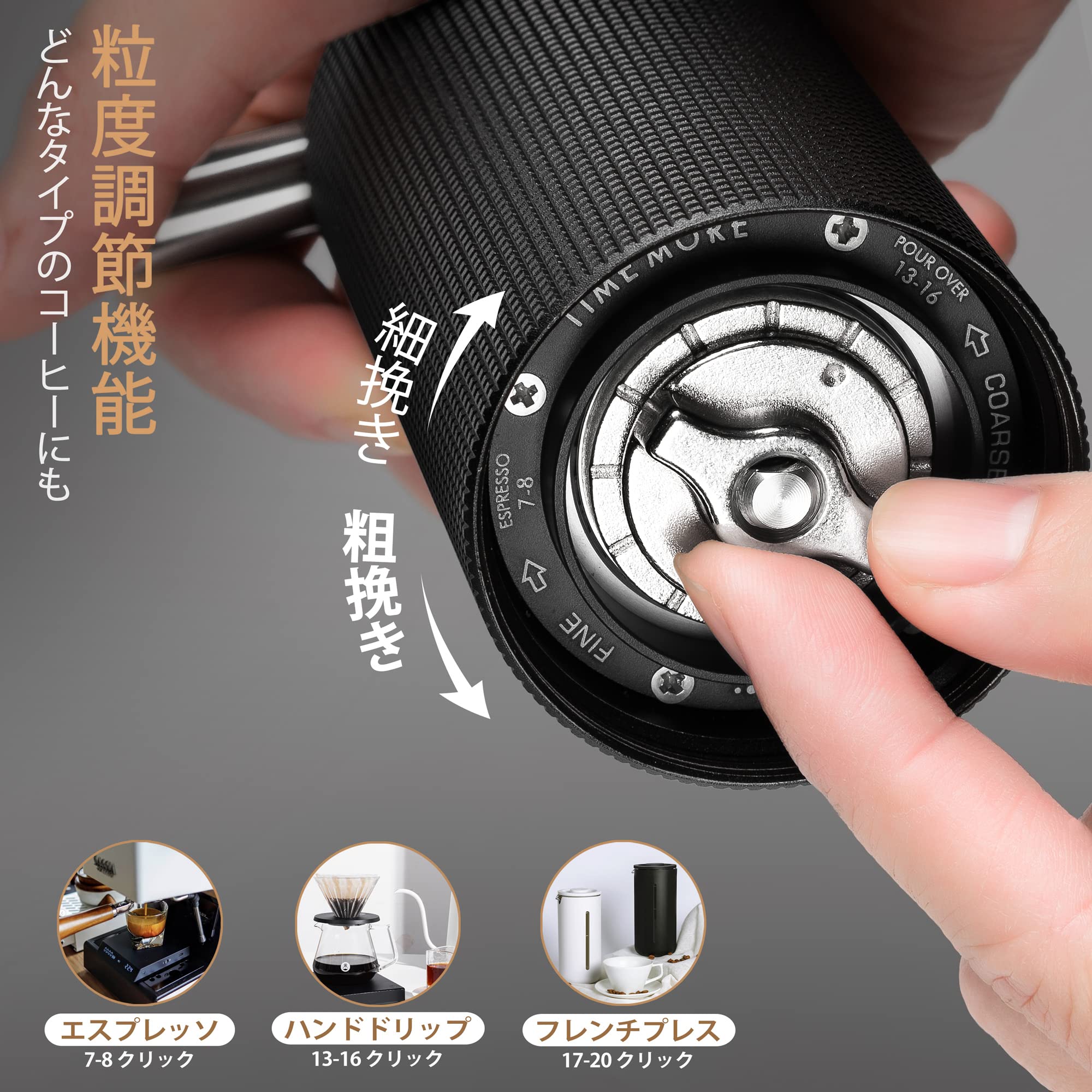 【在庫処分】TIMEMOREタイムモア C3 MAX PRO コーヒーミル 手動 折り畳み式ハンドル 手挽き グラインダー ステンレス臼 粗さ調整可能 ブラシ付き アウトドア 持ち運びやすい お手入れ簡単 ブラック