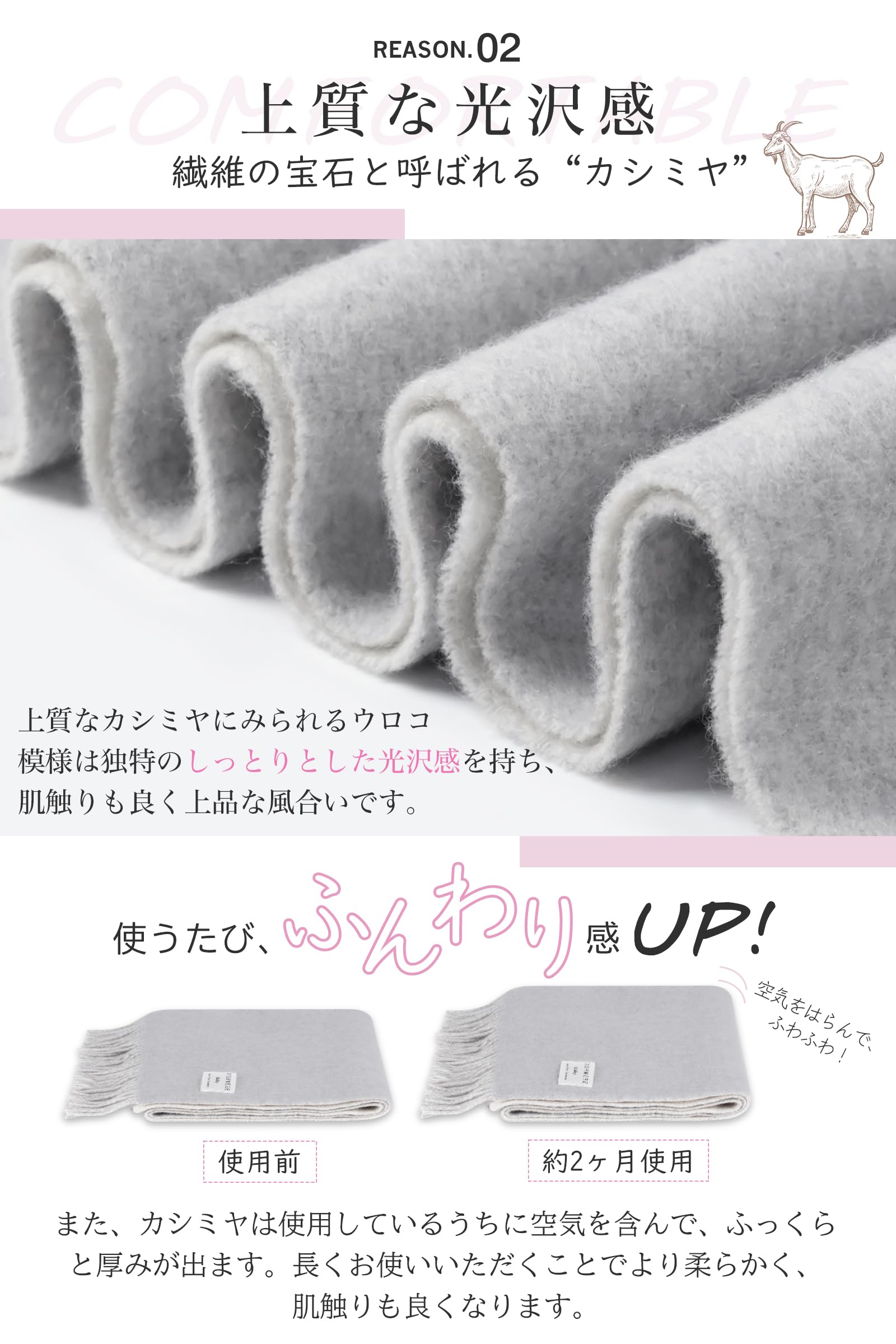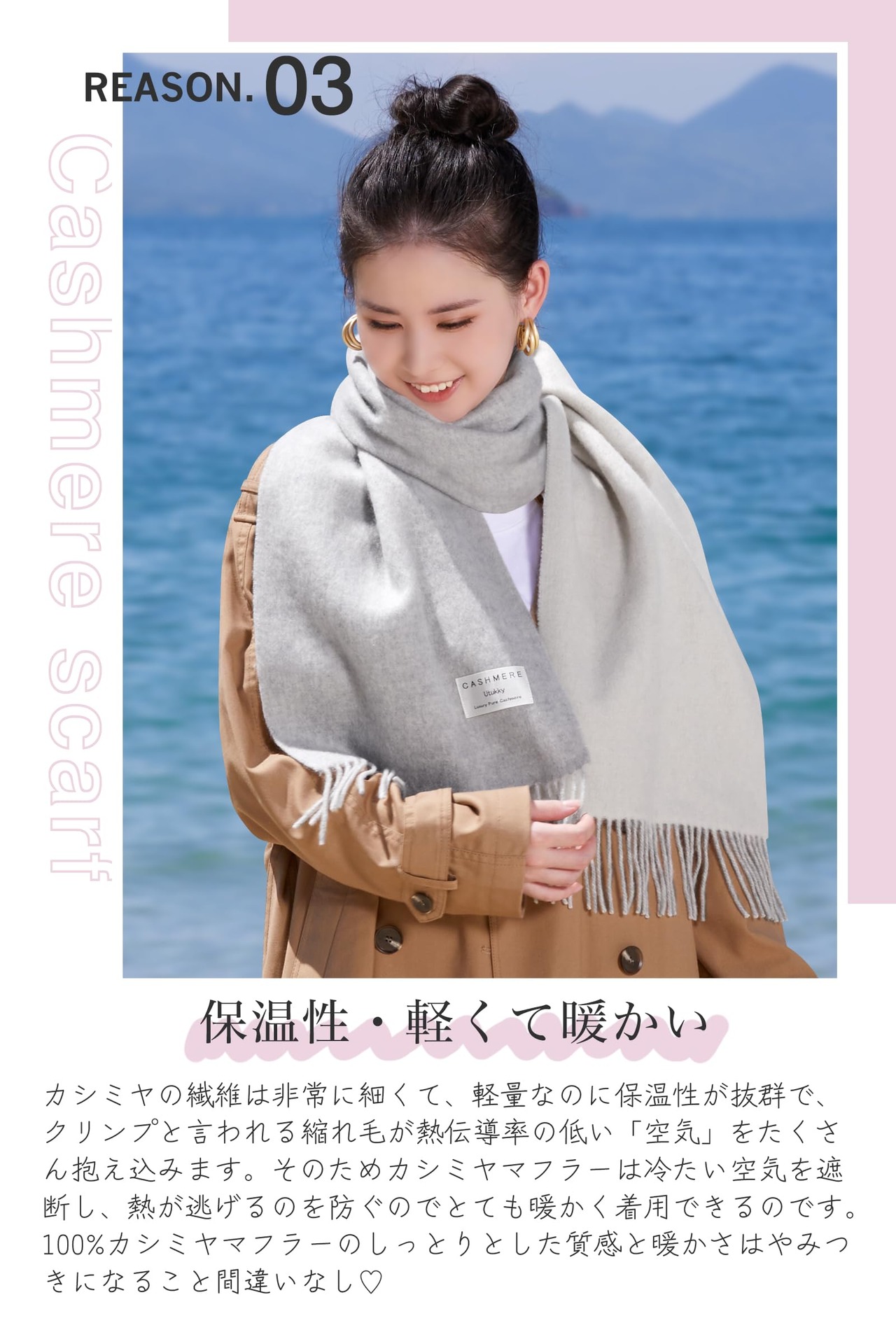 【上質な光沢・優しい肌触り】カシミヤは、ウール原料の中でも最高級とされる素材です。繊維が細く柔軟なため、非常に柔らかな肌触りと上品な光沢を持っています。また、カシミヤマフラーは使用するうちに空気を含み、ふっくらと厚みを増します。長い間ご使用いただくことで、ますます柔らかさが増し、肌触りも向上します。このスカーフは肌に優しく、贅沢な柔らかさを備えており、耐久性も優れているため、何年もご愛用いただけます。本物のカシミヤの肌触りと暖かみを感じてください。