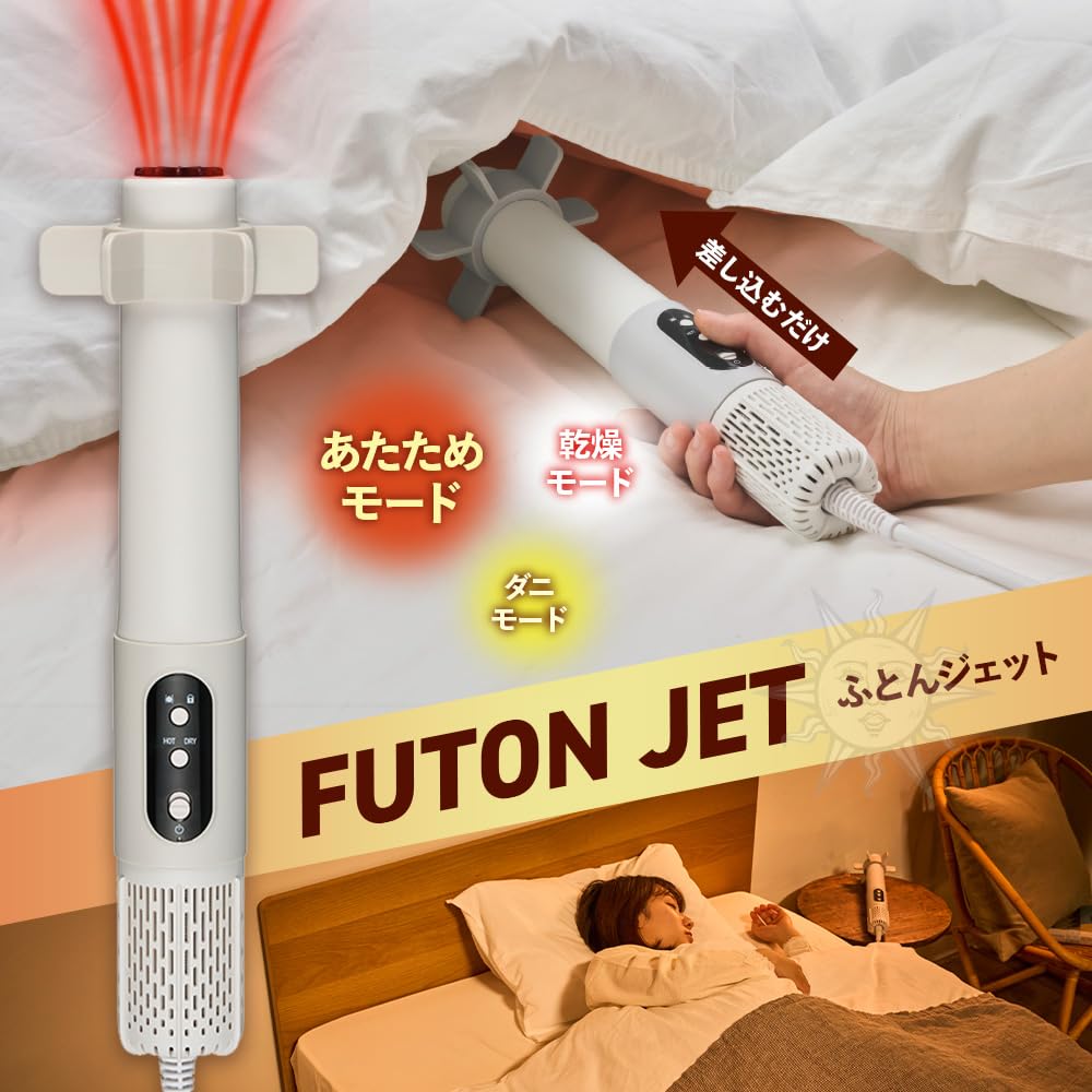 1年中気持ちいい、ふとんに差し込むだけで強力乾燥、冷たいふとんが即ぽかぽかのふとんジェット。